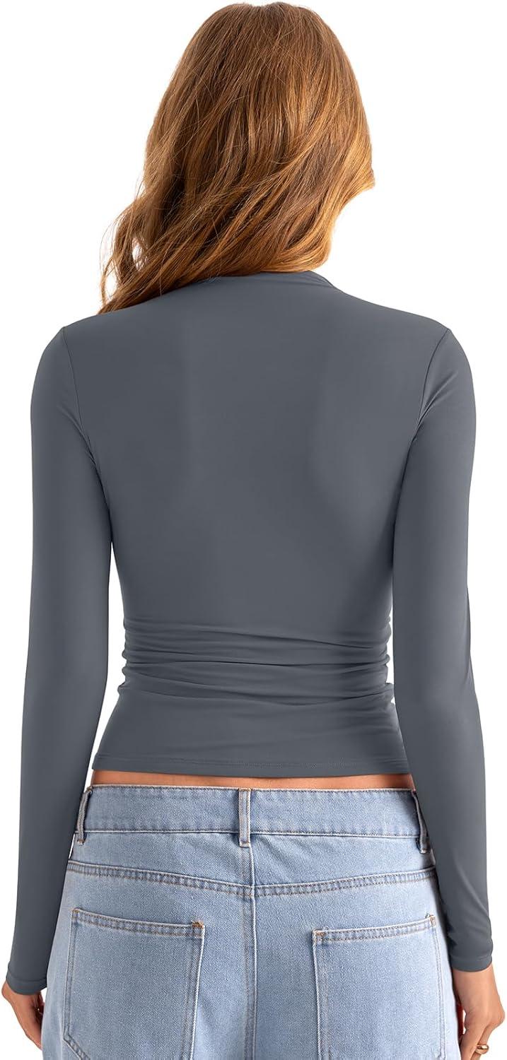 Womens Double Lined Mock Turtle Neck Long Sleeve Tops Slim Fitted Going Out Tops Basic T Shirts(Grey)