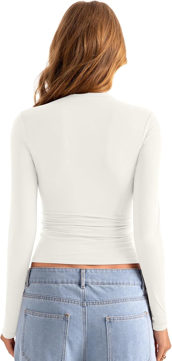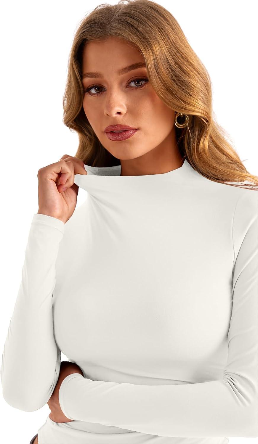 Womens Double Lined Mock Turtle Neck Long Sleeve Tops Slim Fitted Going Out Tops Basic T Shirts(White Cream)