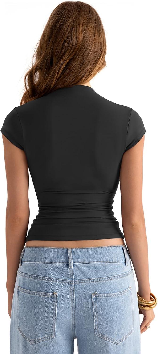 Womens Double Lined Mock Turtle Neck Tops Slim Fitted Cap Sleeve Shirts Going Out Tees Y2k Summer Clothes 2025(Black)