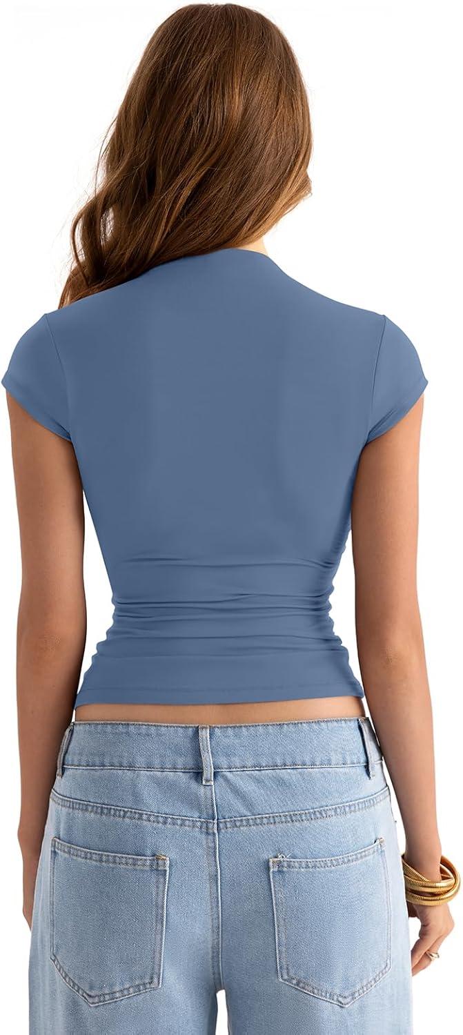 Womens Double Lined Mock Turtle Neck Tops Slim Fitted Cap Sleeve Shirts Going Out Tees Y2k Summer Clothes 2025(Haze Blue)