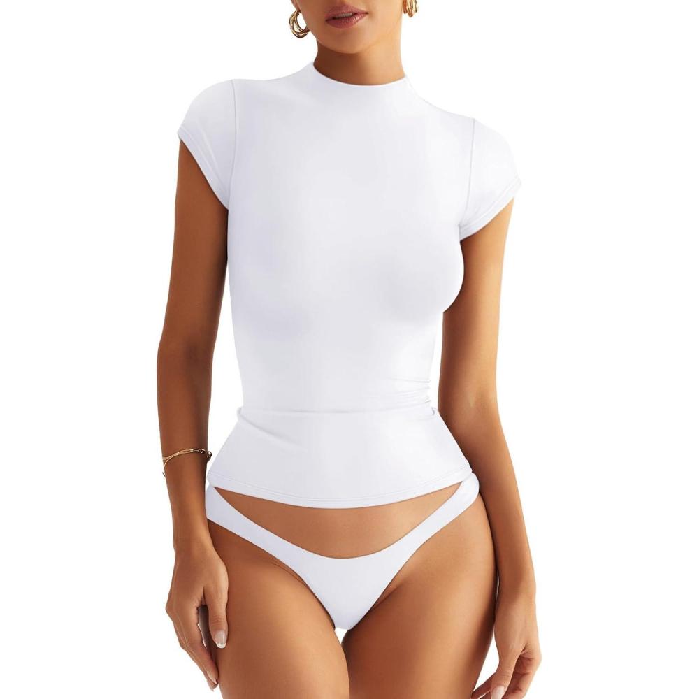 Womens Double Lined Mock Turtle Neck Tops Slim Fitted Cap Sleeve Shirts Going Out Tees Y2k Summer Clothes 2025(Pure White)