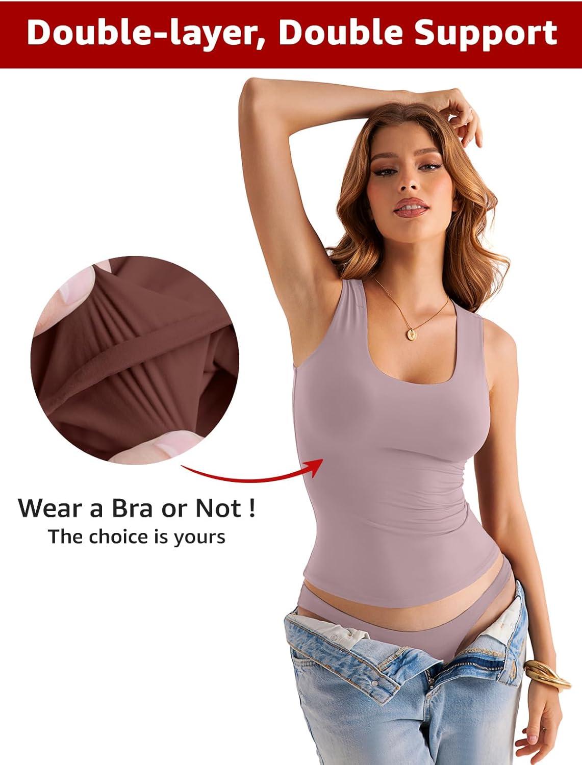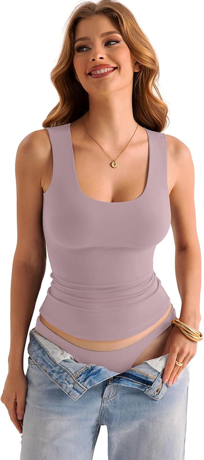 Womens Double Lined Scoop Neck Tank Tops Basic Slim Fit Sleeveless Shirts Y2K Summer Going Out Outfits(Dusty Pink)