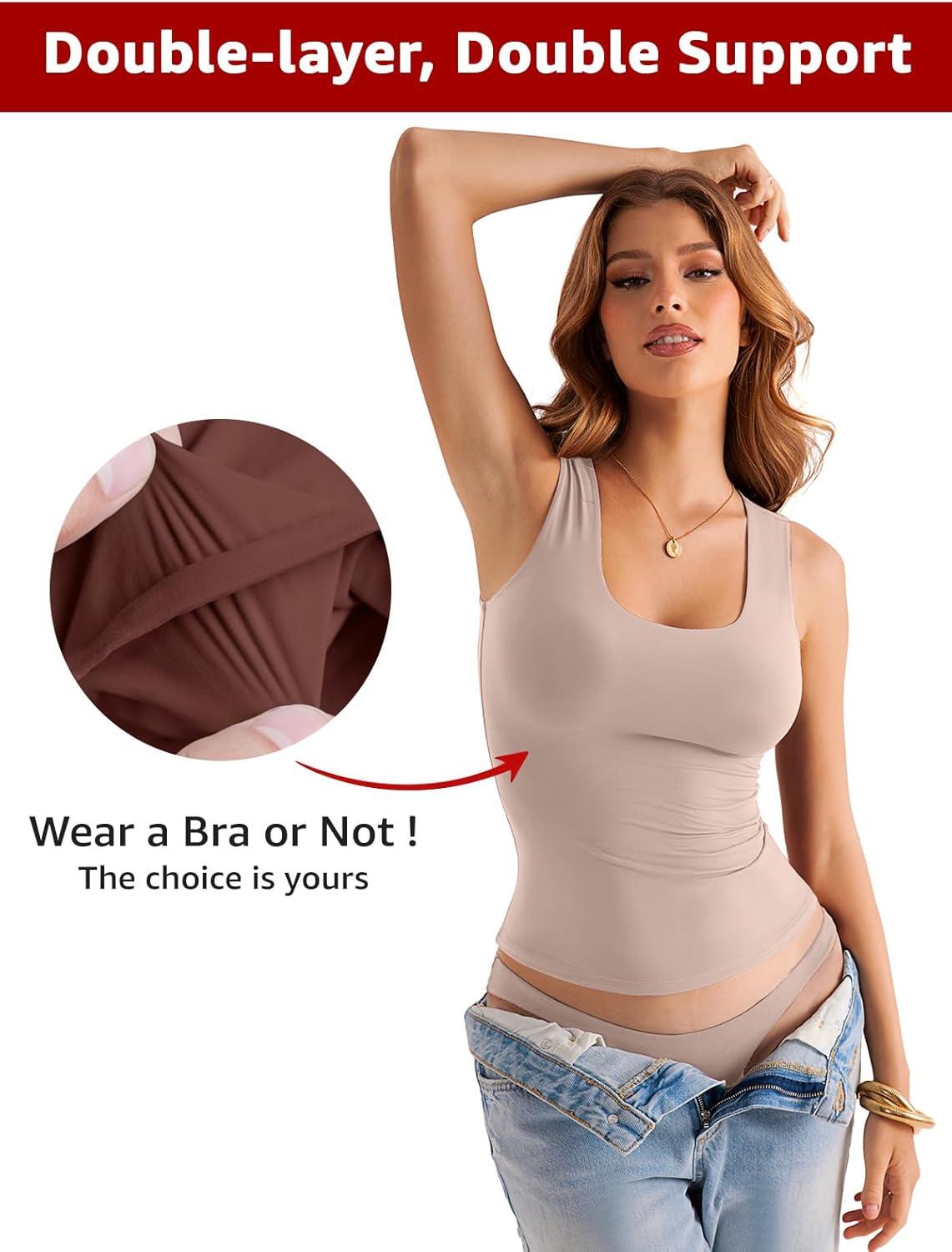 Womens Double Lined Scoop Neck Tank Tops Basic Slim Fit Sleeveless Shirts Y2K Summer Going Out Outfits(Khaki)