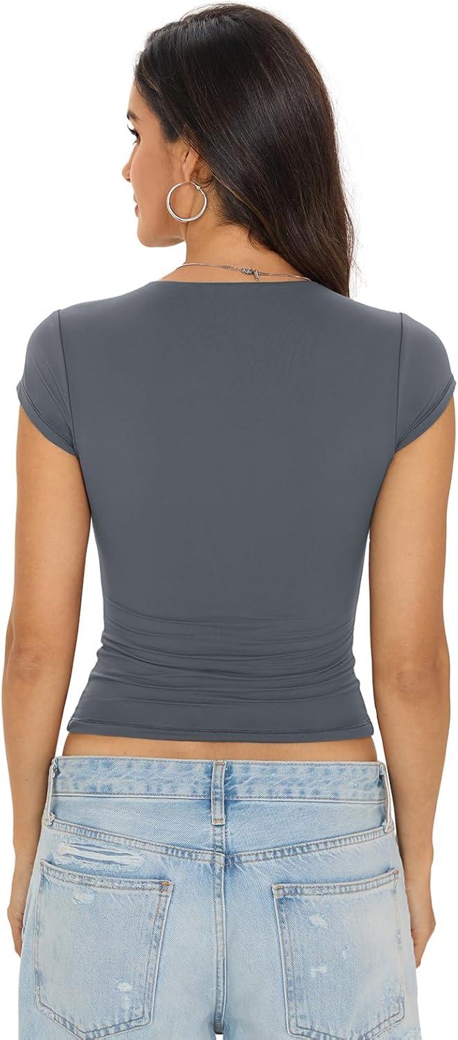 Womens Double Lined Tops Cropped Cap Sleeve Shirts Crew Neck Fitted Going Out Tees Y2k Summer Clothes 2026(Grey)
