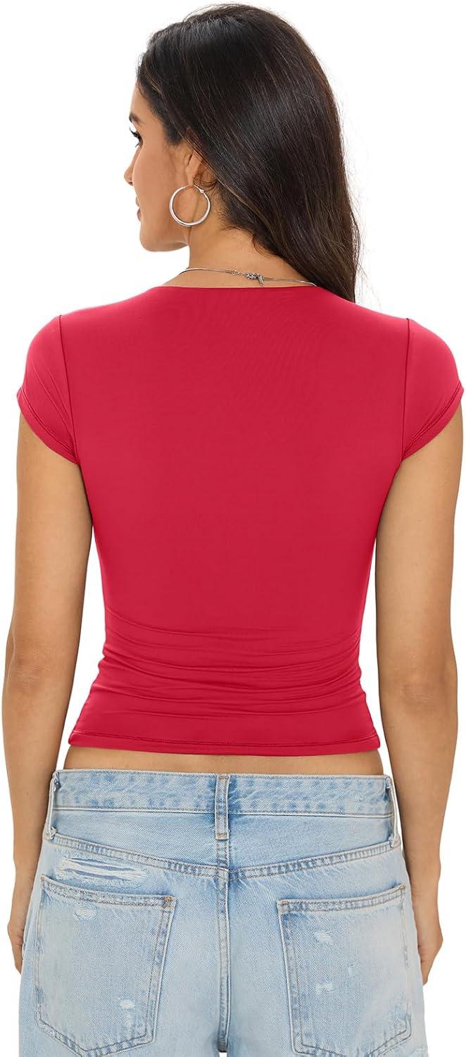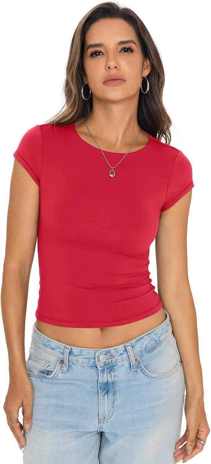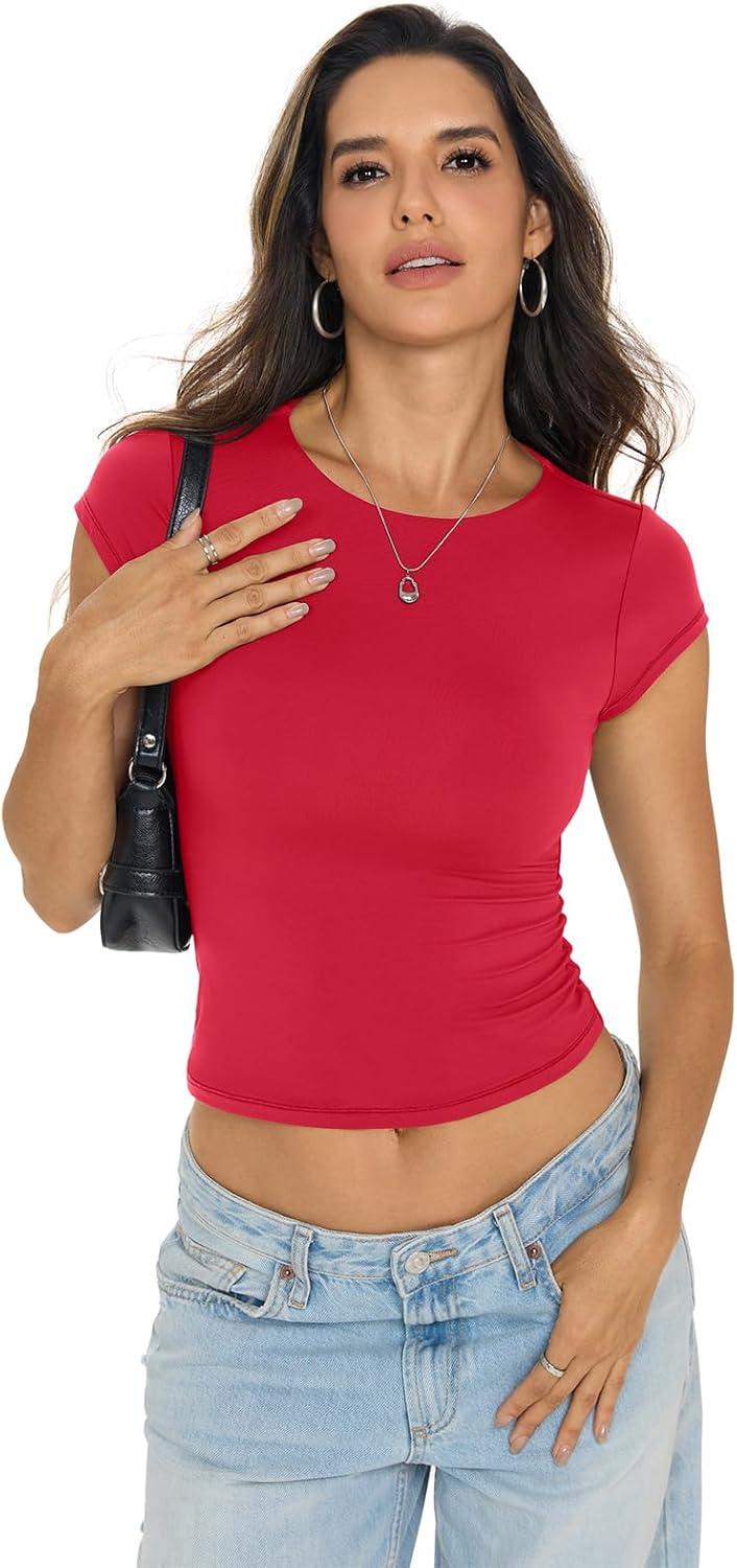 Womens Double Lined Tops Cropped Cap Sleeve Shirts Crew Neck Fitted Going Out Tees Y2k Summer Clothes 2026(Red)
