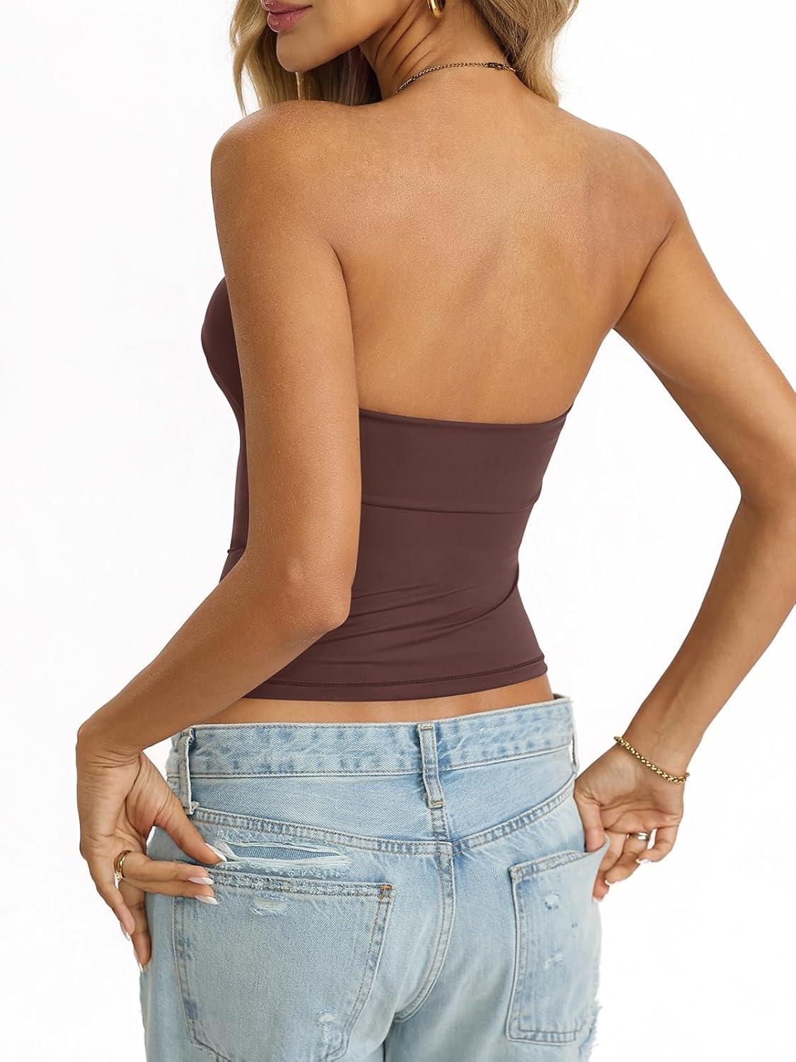 Womens Double Lined Tube Tops Non Slip Bandeau Strapless Shirts Slim Fit Sexy Going Out Tank Tops Summer 2026(Brown)