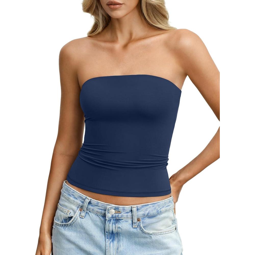 Womens Double Lined Tube Tops Non Slip Sexy Strapless Bandeau Top Y2K Sleeveless Going Out Tops Summer Outfits(Navy Blue)