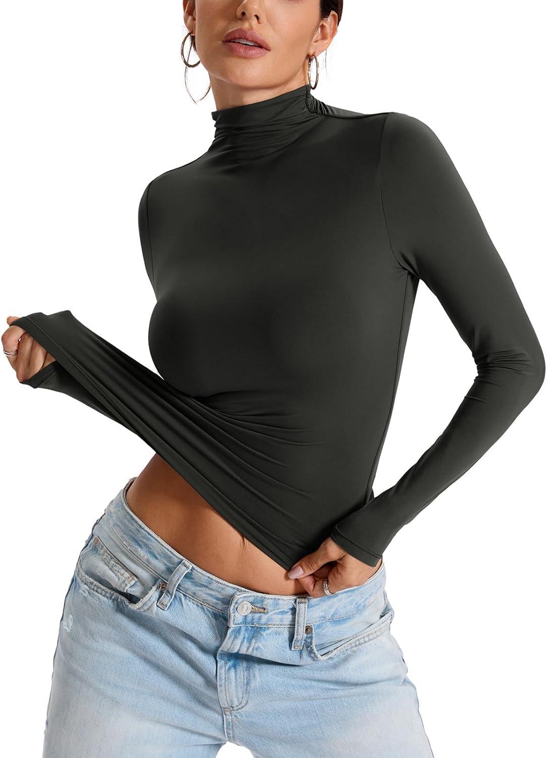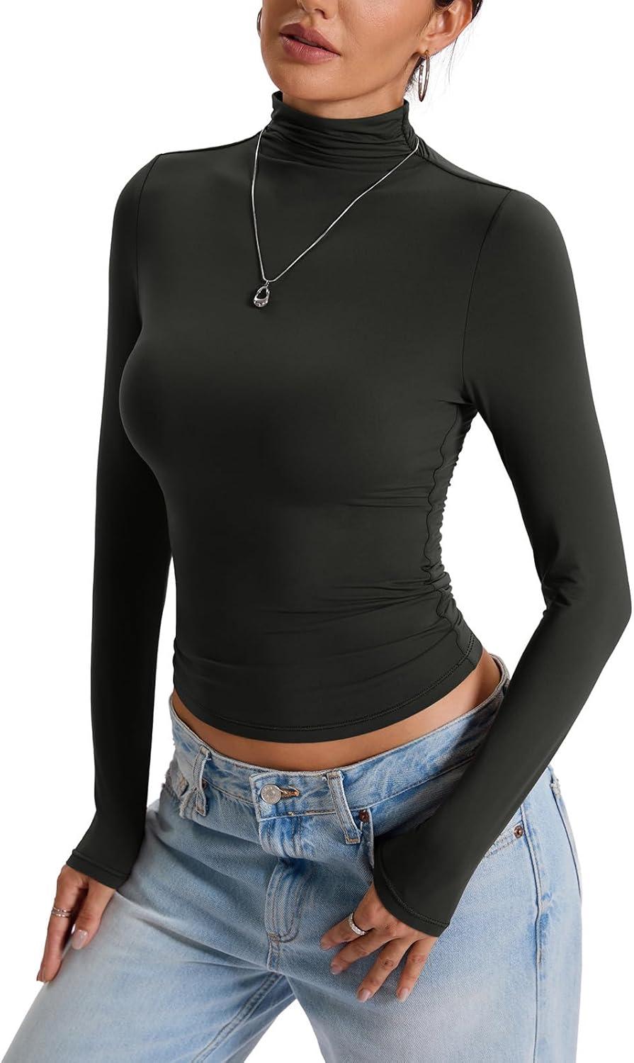 Womens Double Lined Turtleneck T Shirts Back Zipper Long Sleeve Shirts Fitted Basic Undershirts Fall Oufits(Black)