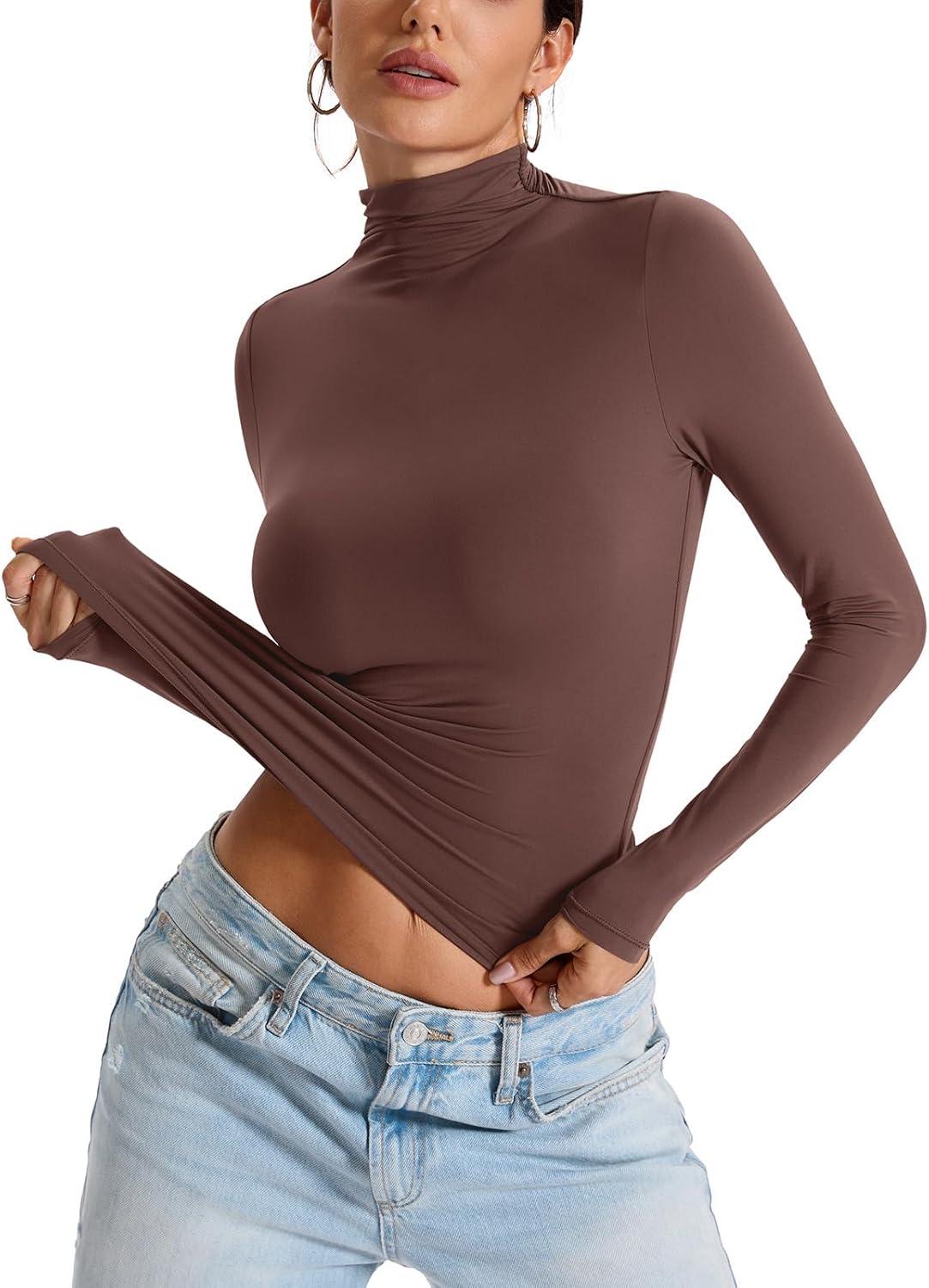 Womens Double Lined Turtleneck T Shirts Back Zipper Long Sleeve Shirts Fitted Basic Undershirts Fall Oufits(Brown)