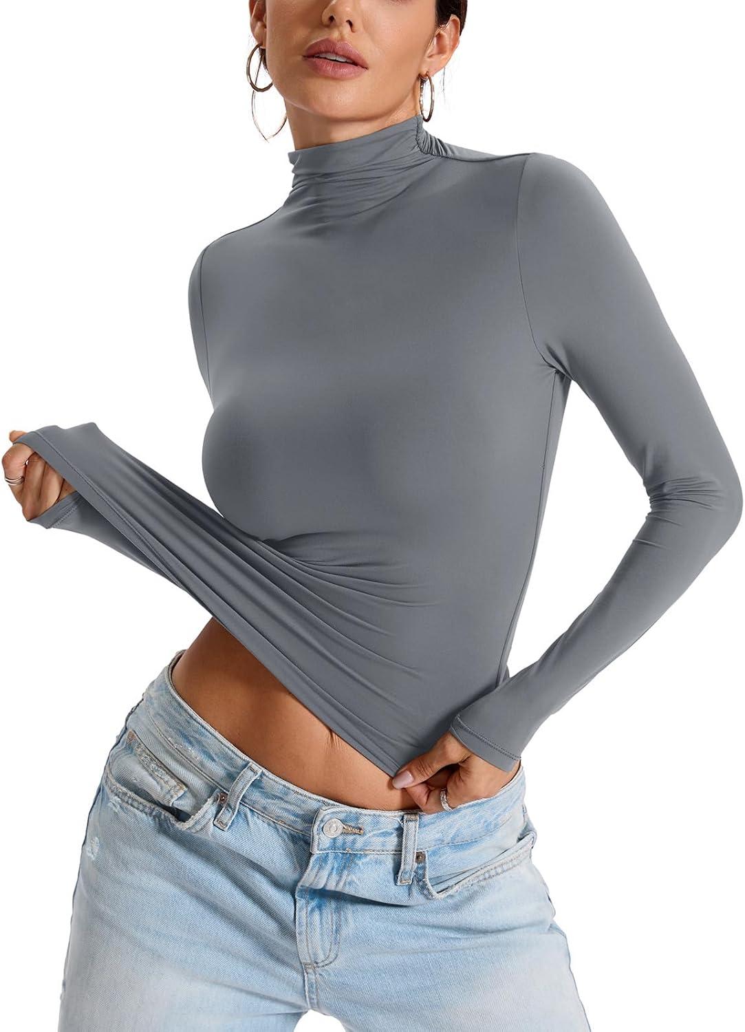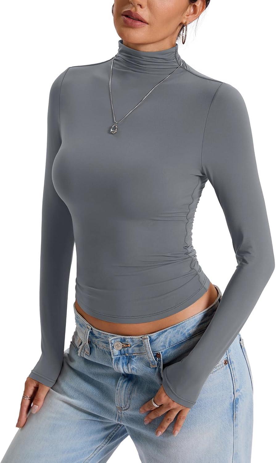 Womens Double Lined Turtleneck T Shirts Back Zipper Long Sleeve Shirts Fitted Basic Undershirts Fall Oufits(Grey)