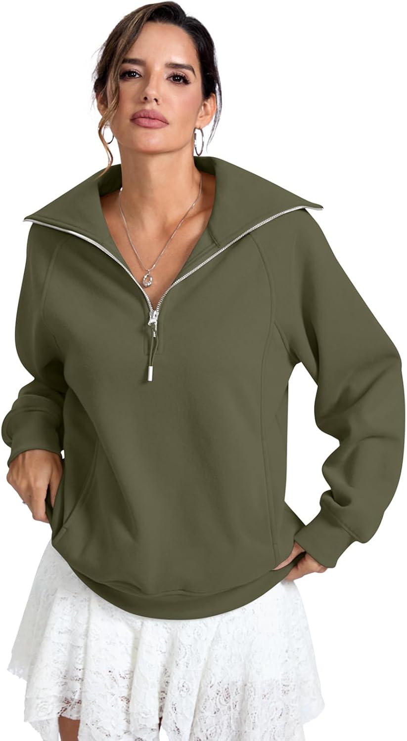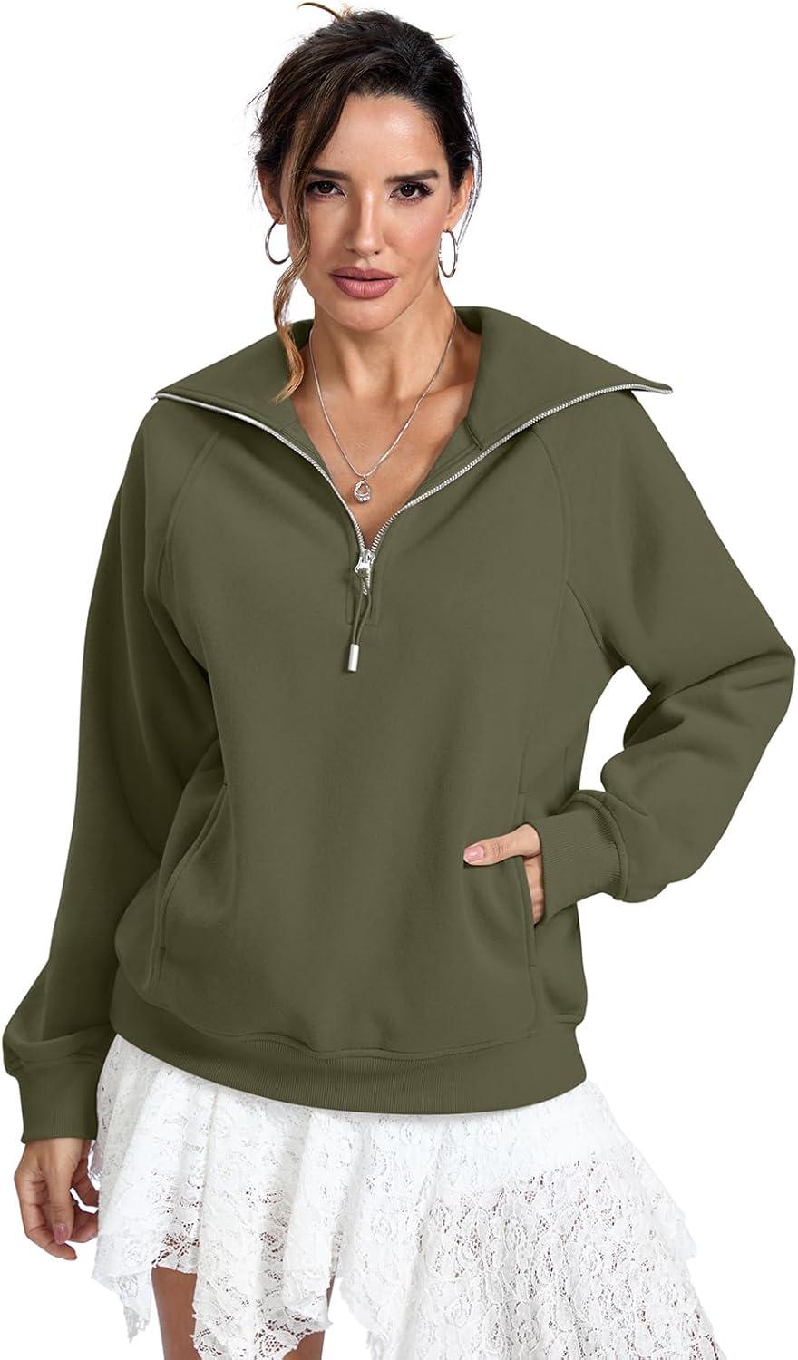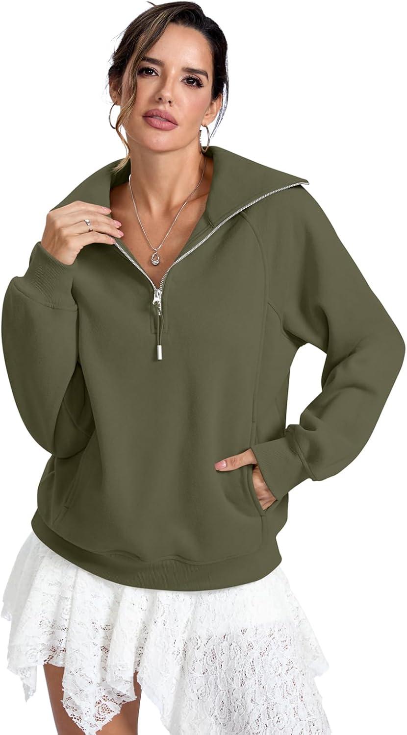 Womens Fleece Lined Sweatshirts Oversized Half Zip Pullover with Pocket Trendy Long Sleeve Tops Outfits Clothes(Army Green)
