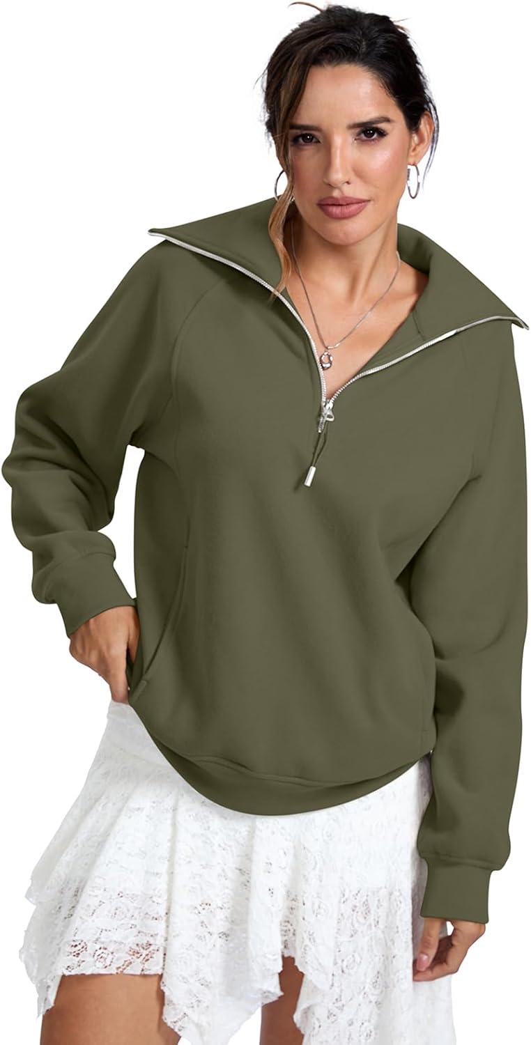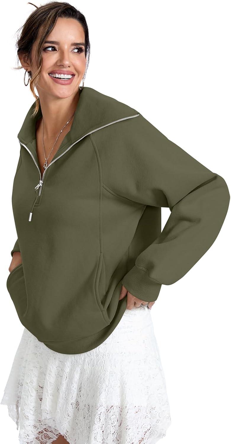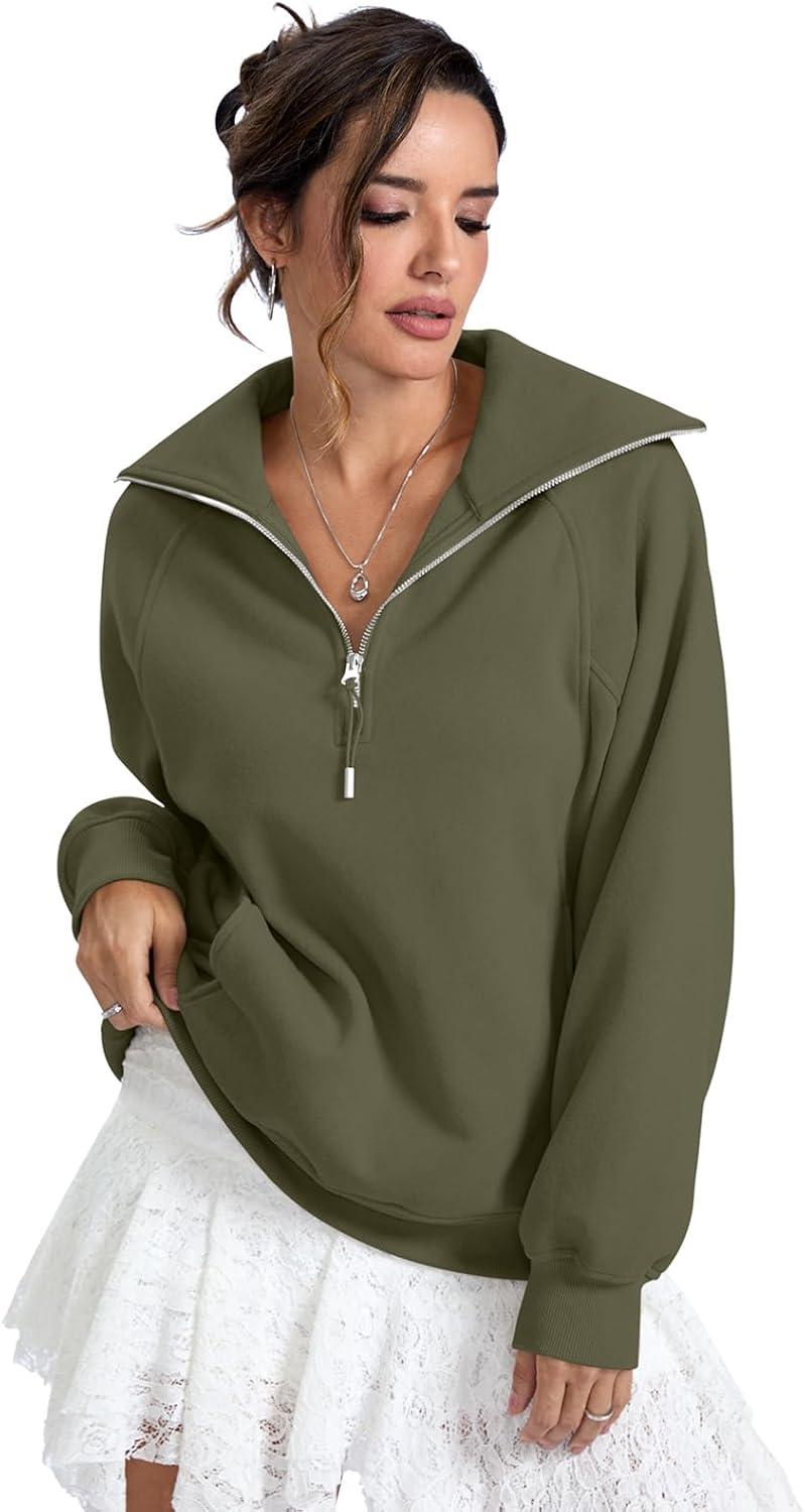 Womens Fleece Lined Sweatshirts Oversized Half Zip Pullover with Pocket Trendy Long Sleeve Tops Outfits Clothes(Army Green)