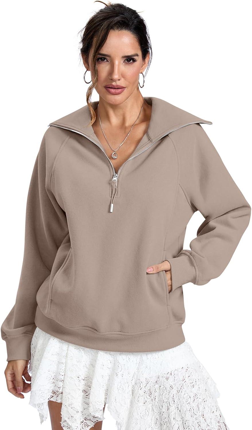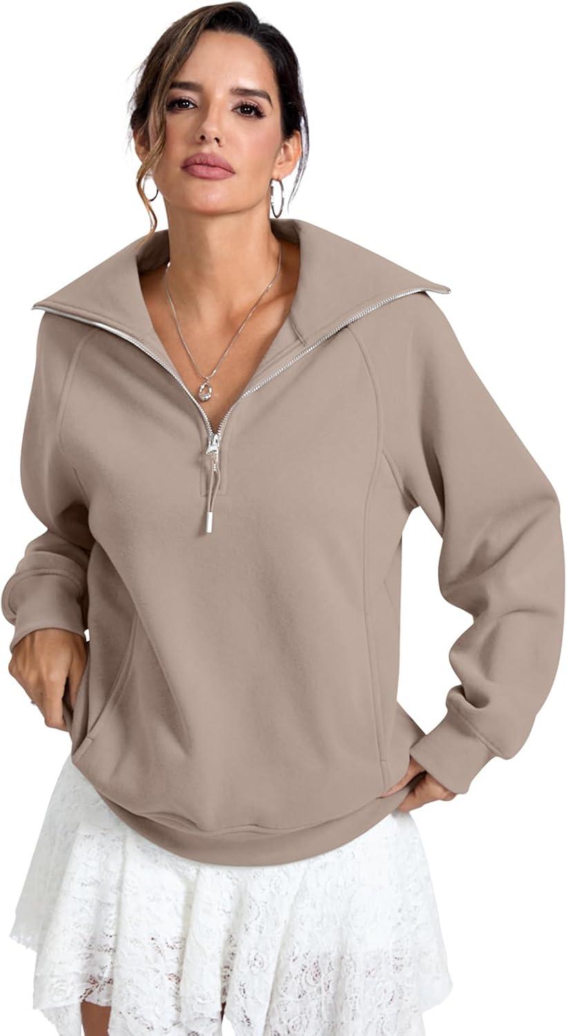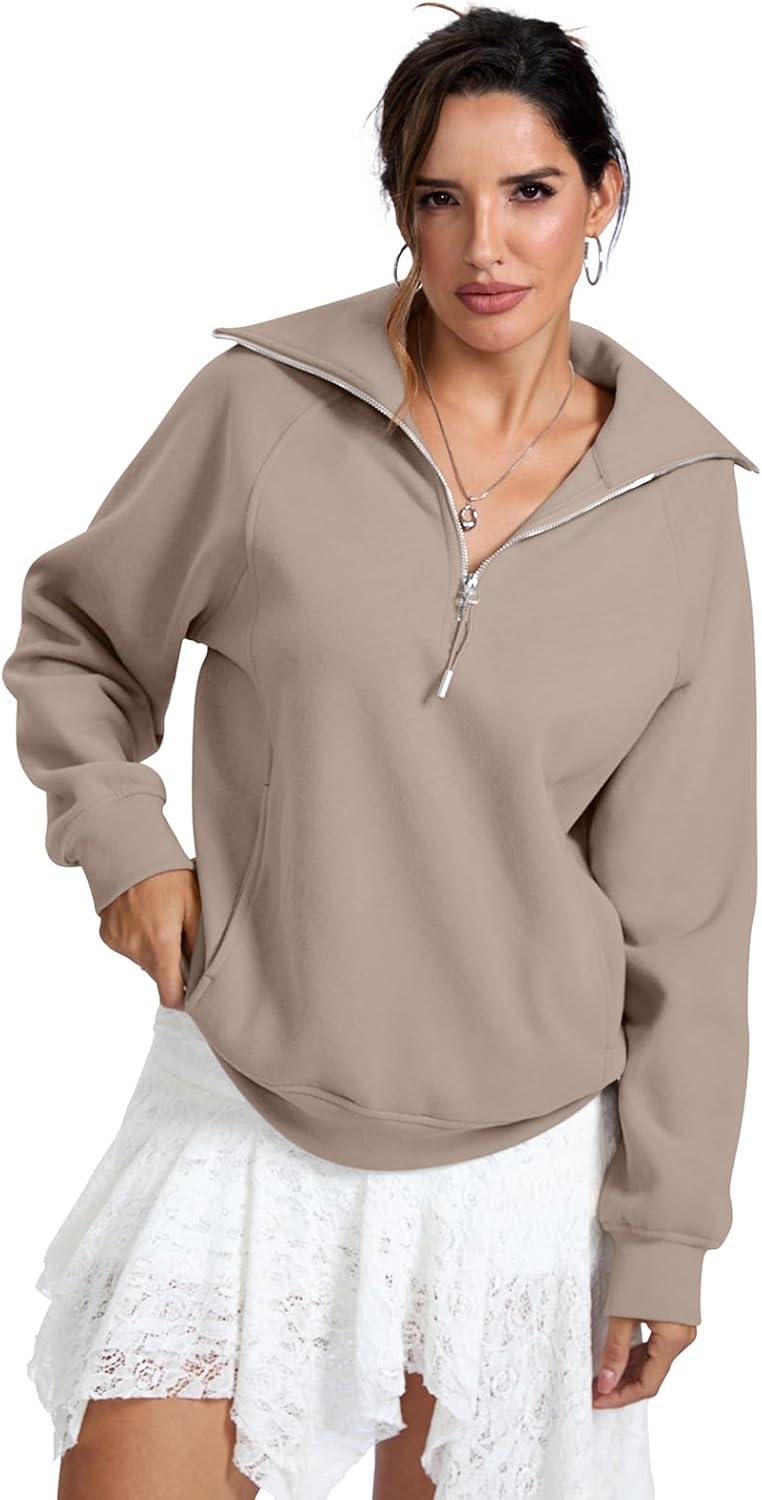 Womens Fleece Lined Sweatshirts Oversized Half Zip Pullover with Pocket Trendy Long Sleeve Tops Outfits Clothes(Coffeegrey)