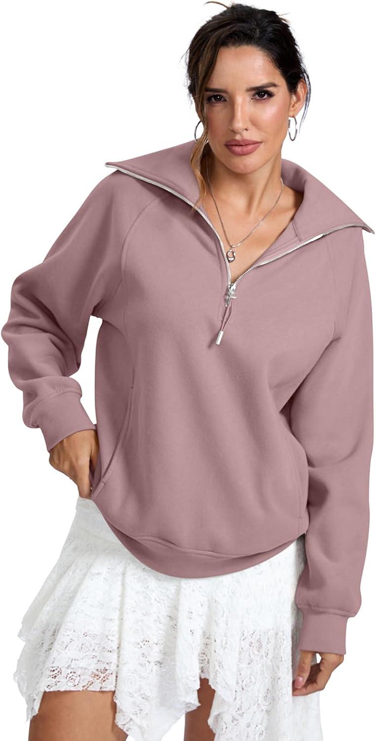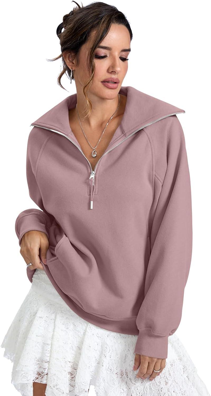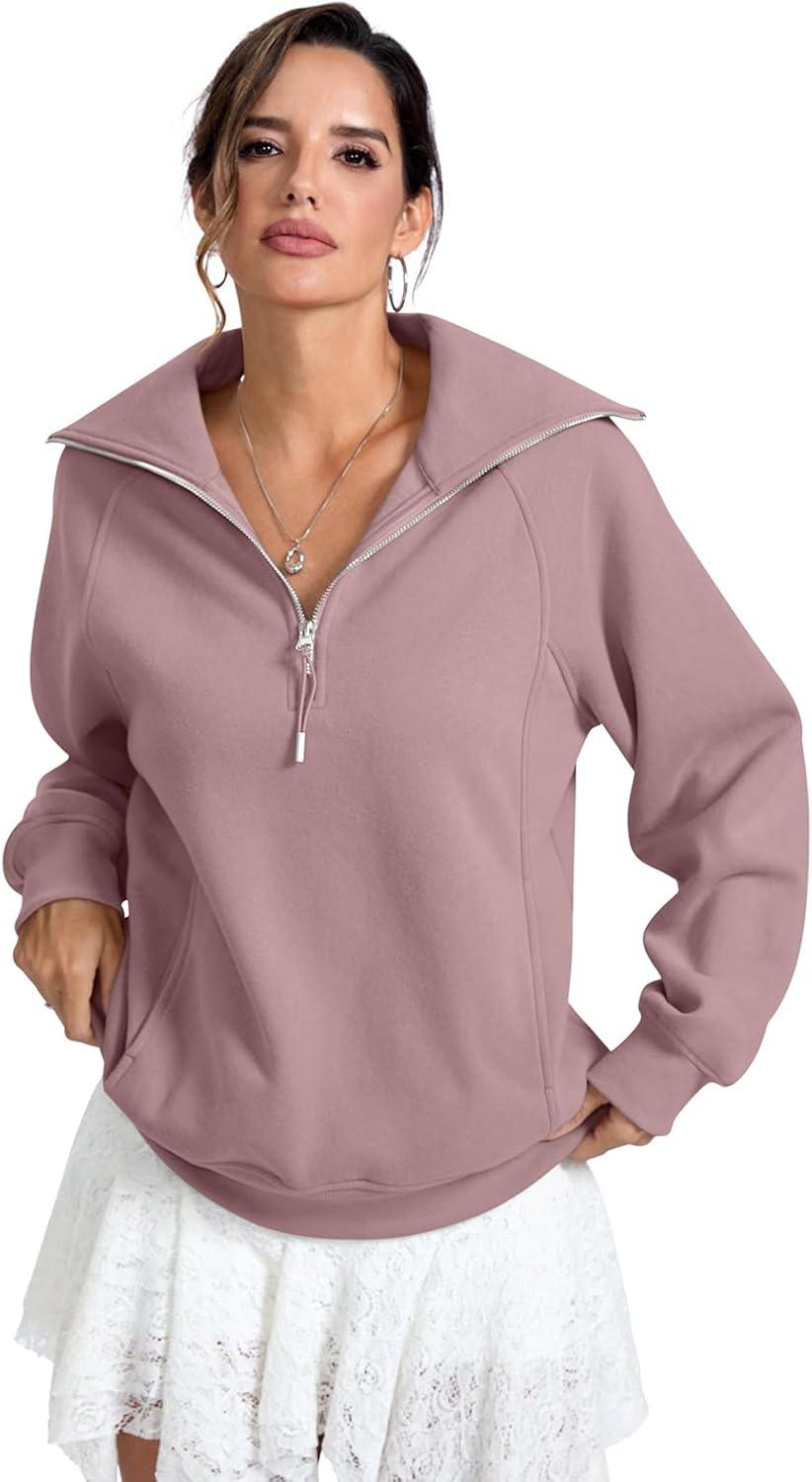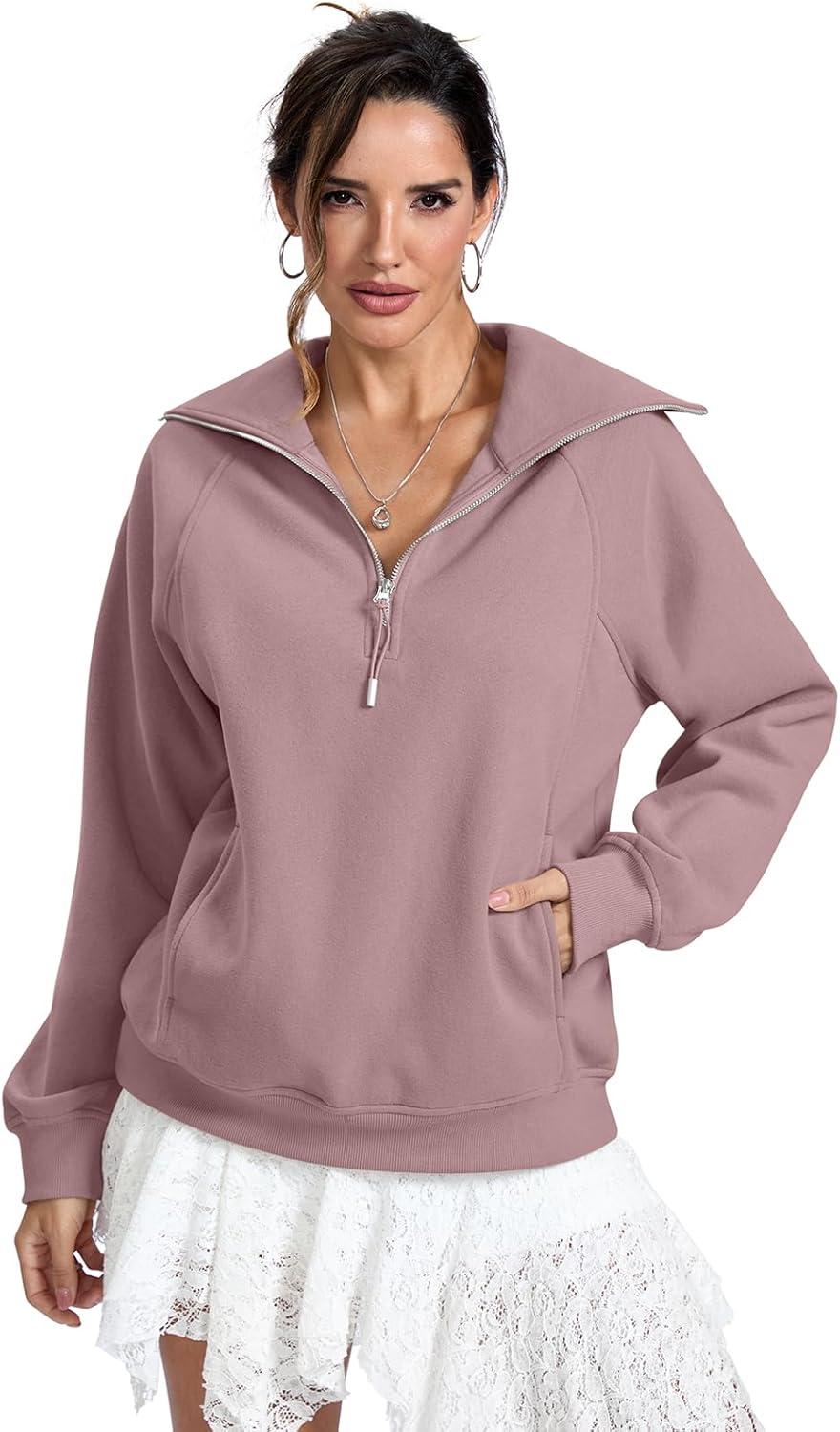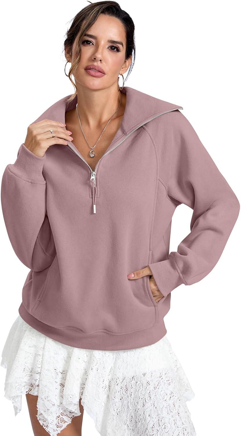 Womens Fleece Lined Sweatshirts Oversized Half Zip Pullover with Pocket Trendy Long Sleeve Tops Outfits Clothes(Dark Pink)