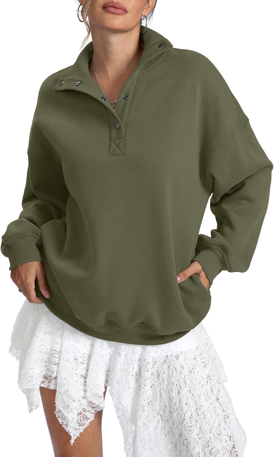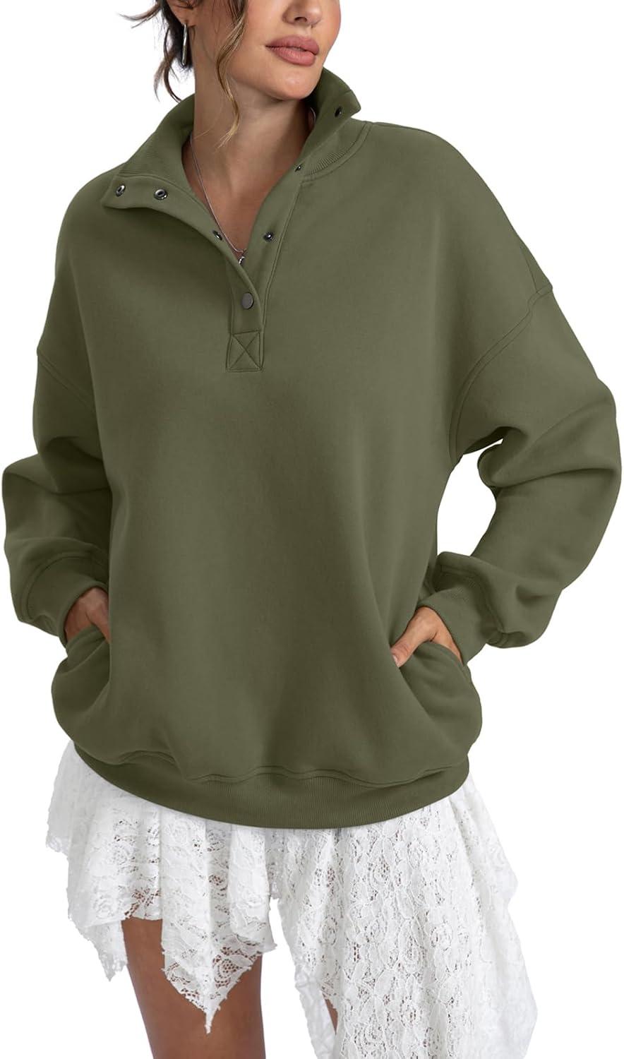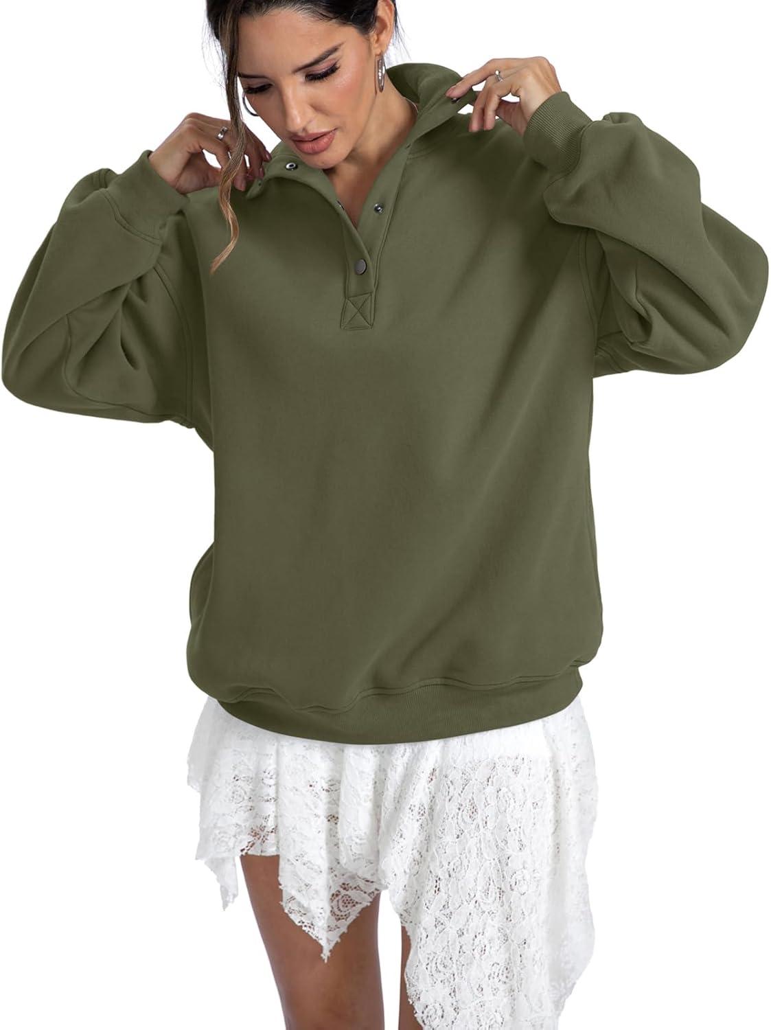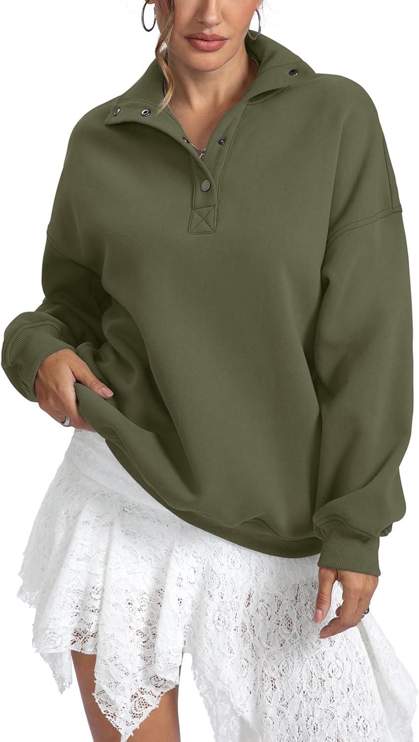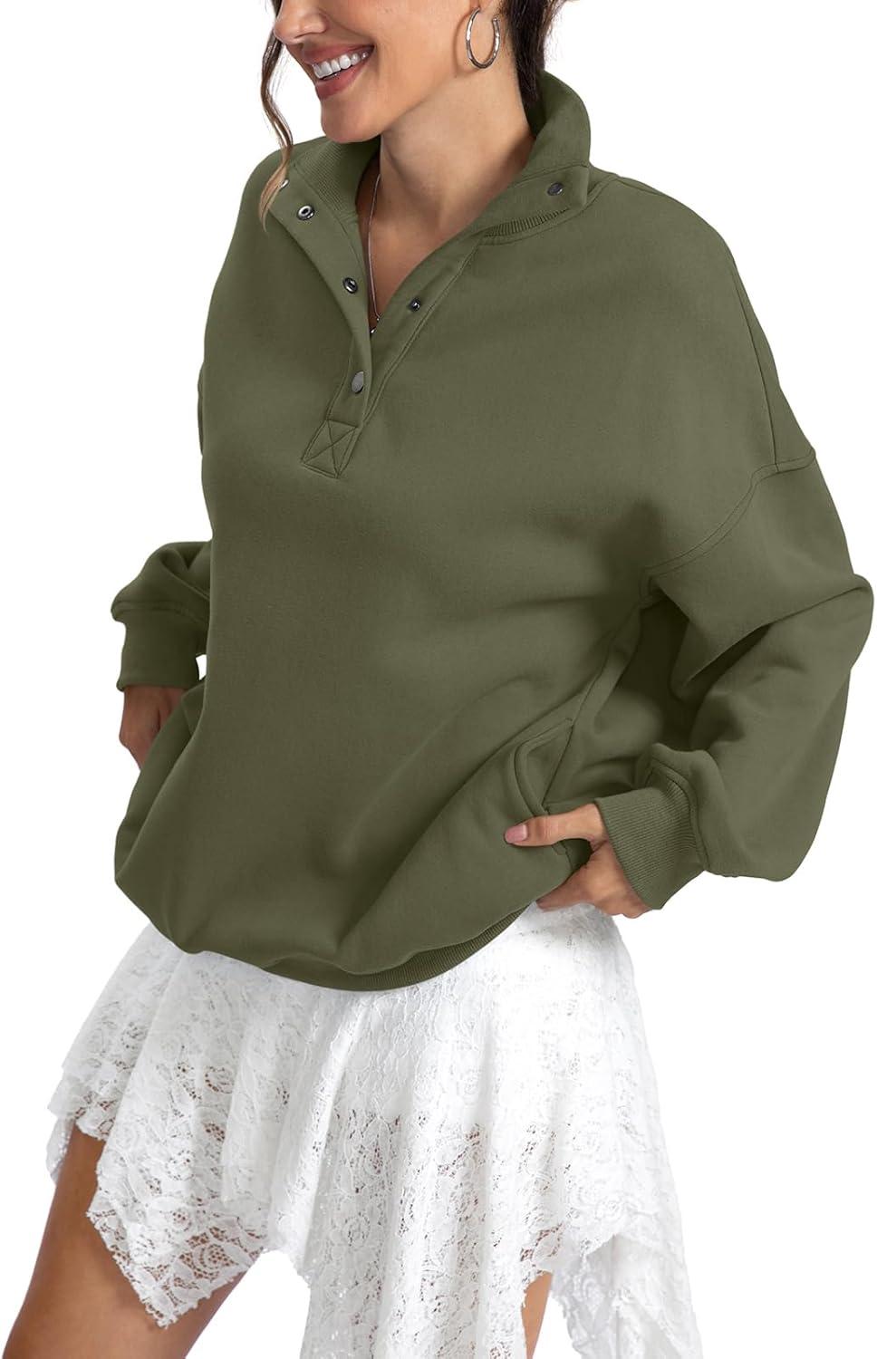 Womens Fleece Sweatshirts Oversized Henley Neck Long Sleeve Button Pullover Tops Trendy Outfits Clothes 2026(Army Green)