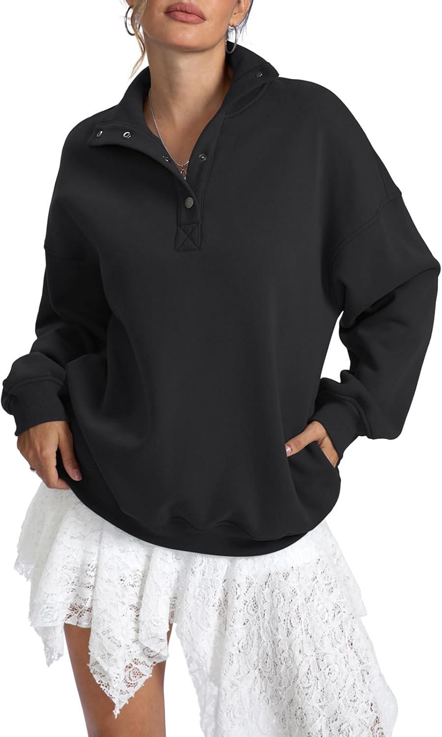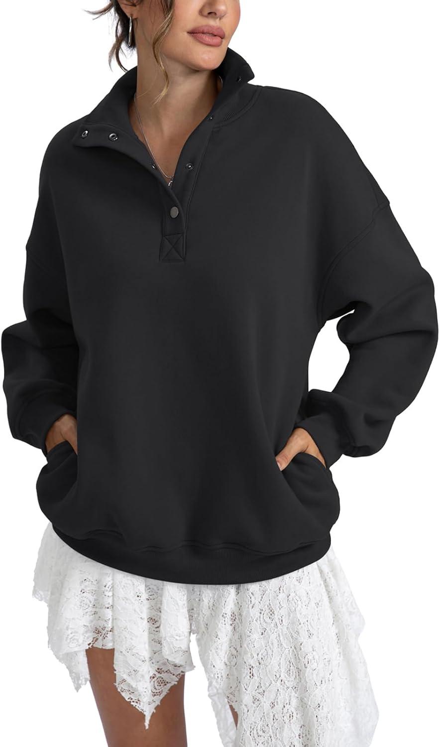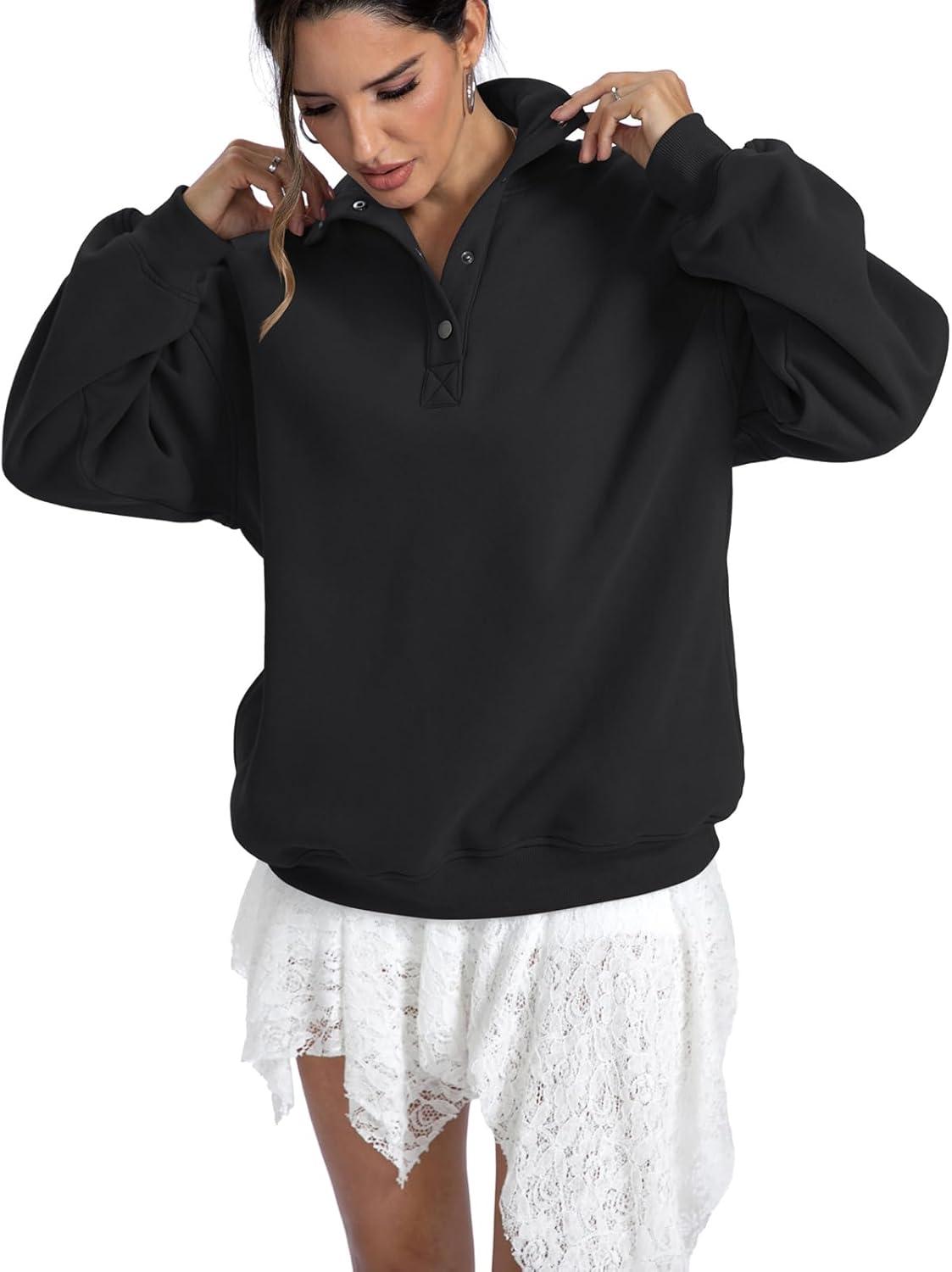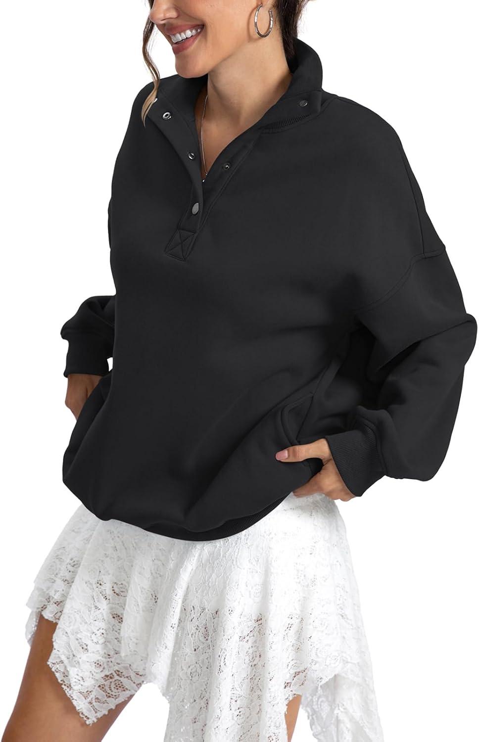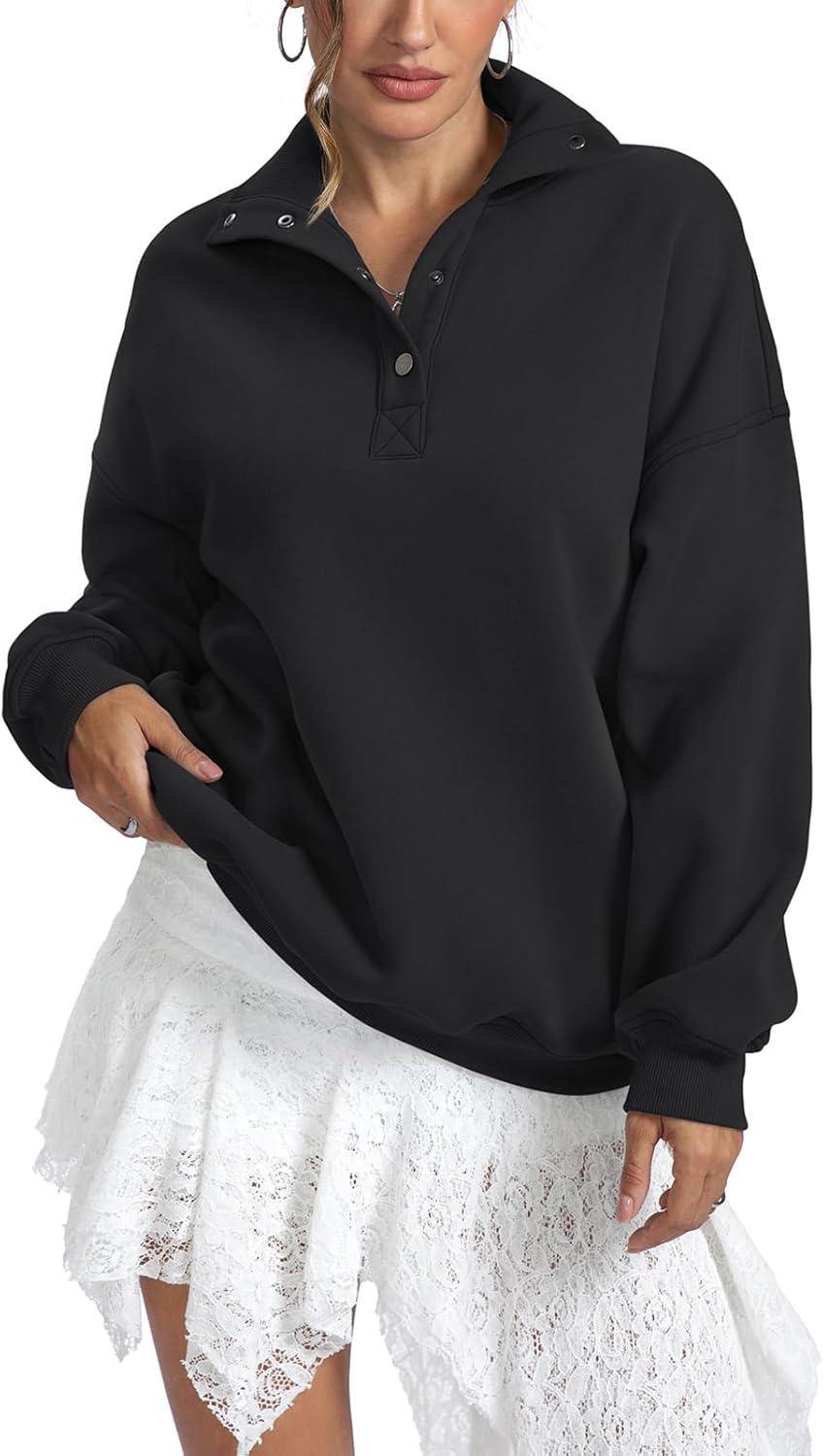 Womens Fleece Sweatshirts Oversized Henley Neck Long Sleeve Button Pullover Tops Trendy Outfits Clothes 2026(Black)