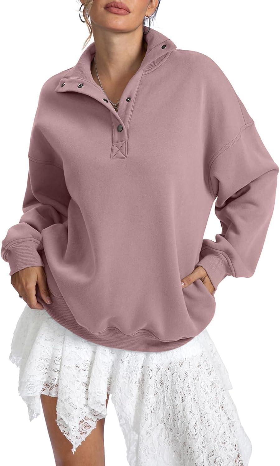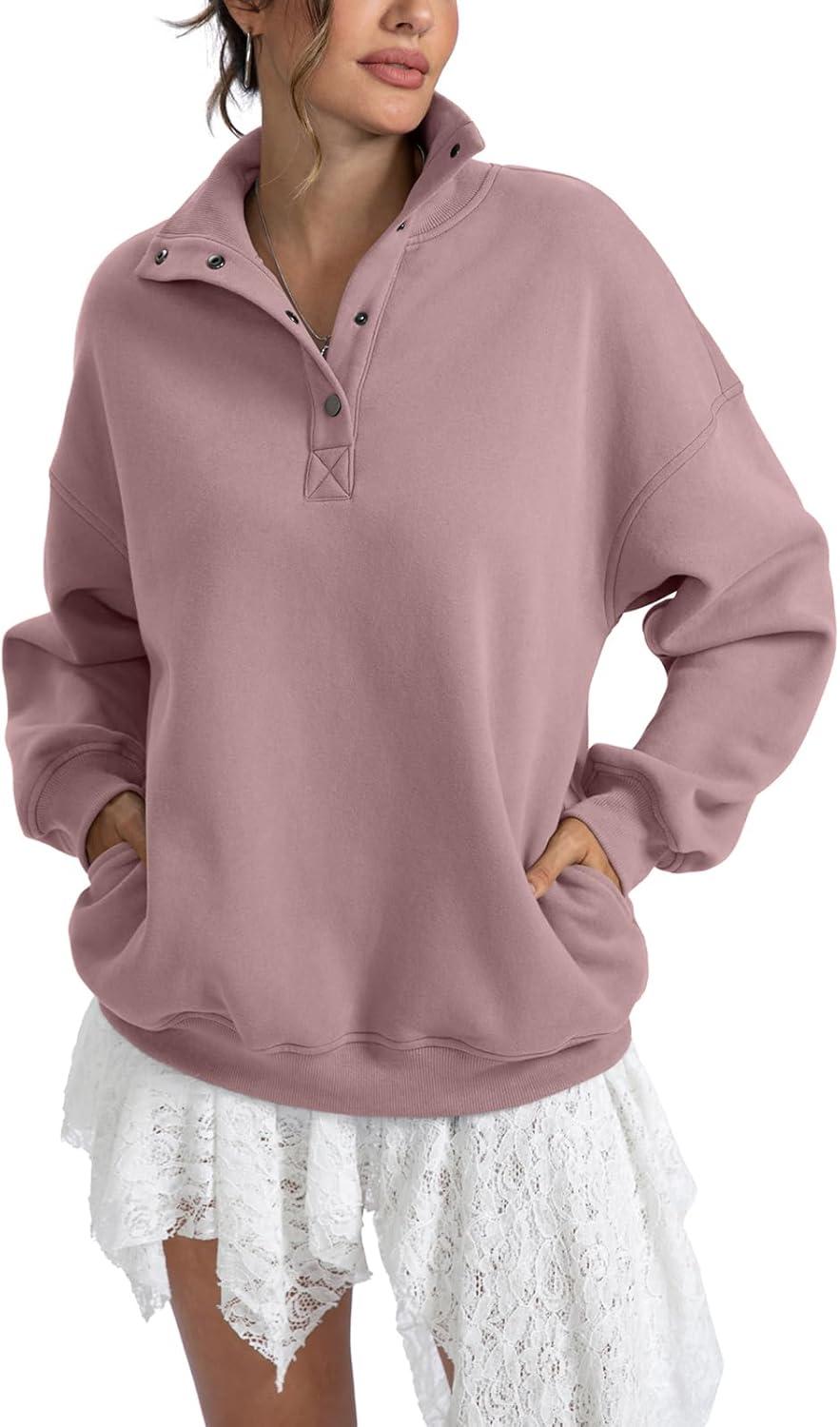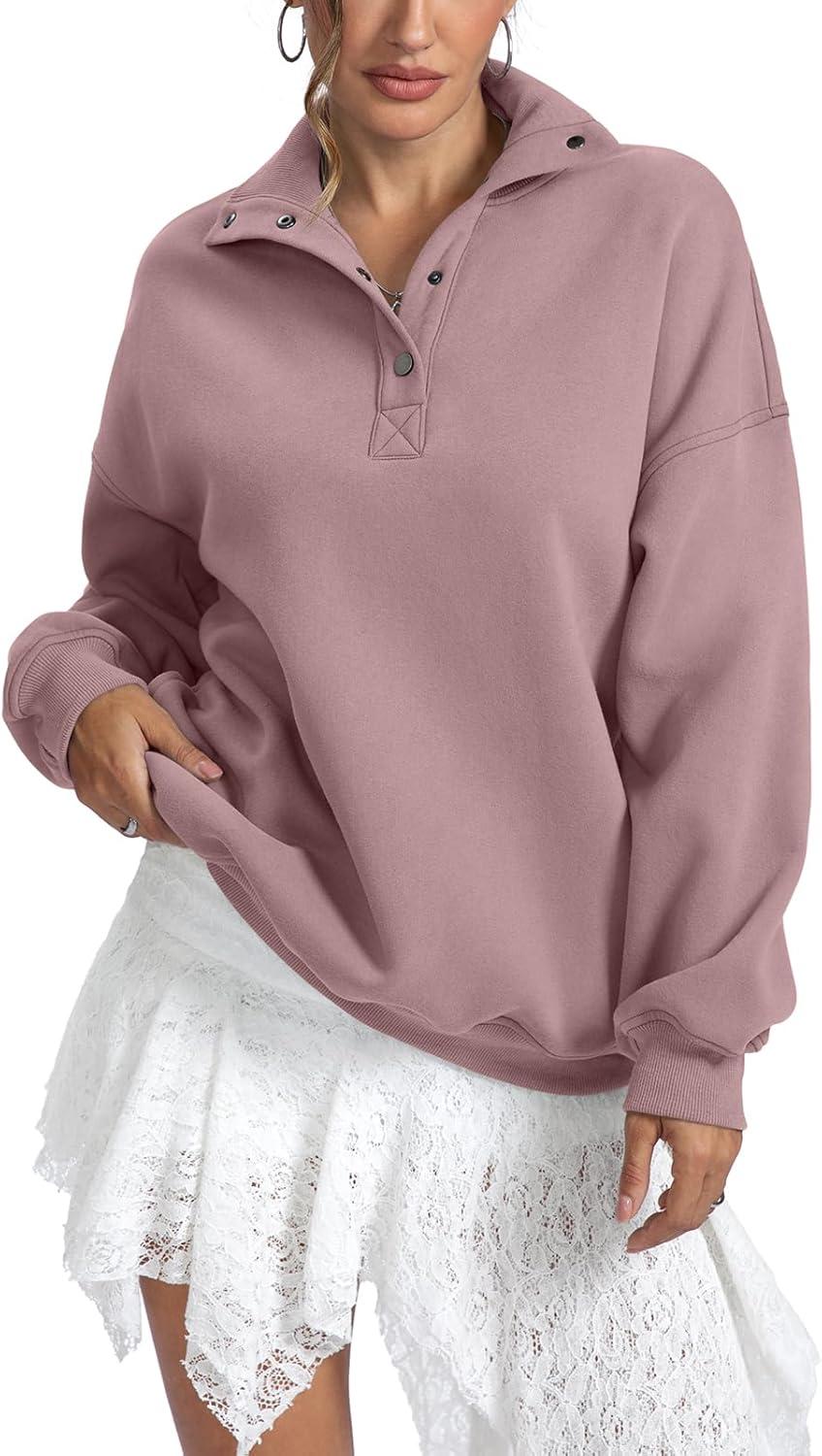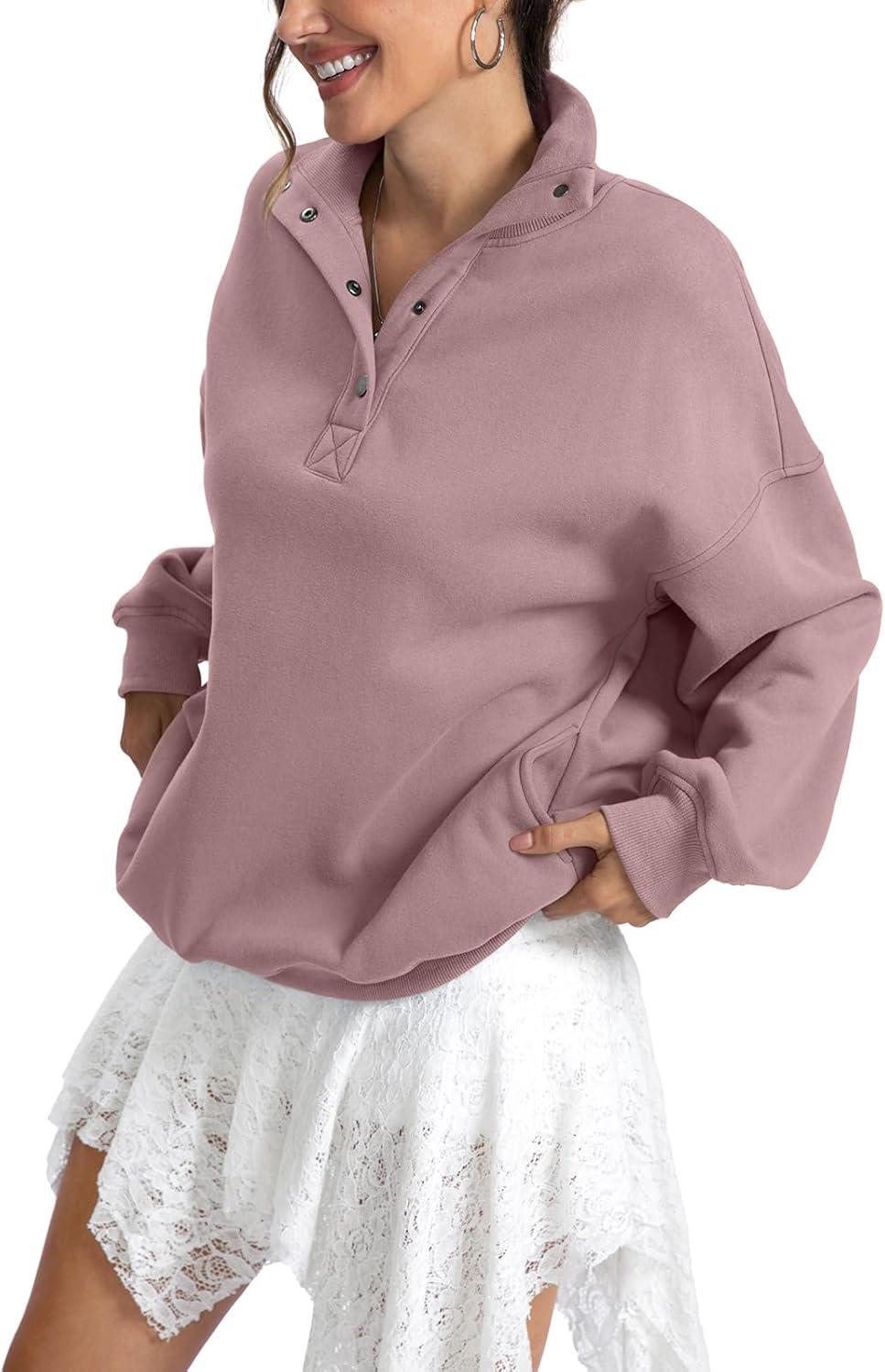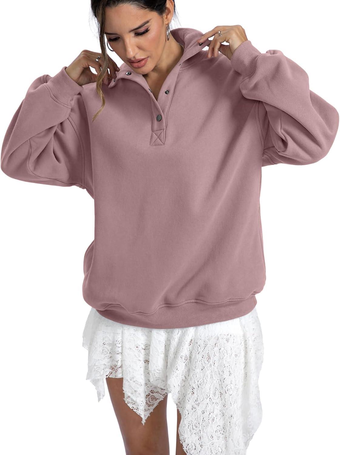 Womens Fleece Sweatshirts Oversized Henley Neck Long Sleeve Button Pullover Tops Trendy Outfits Clothes 2026(Dark Pink)