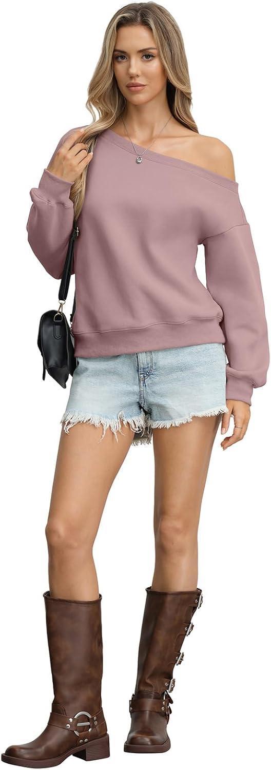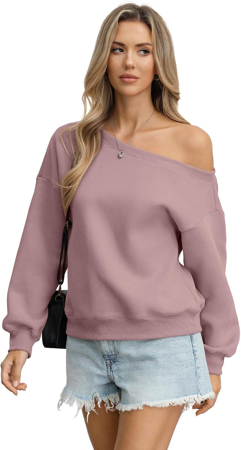 Womens Fleece Sweatshirts Oversized Off The Shoulder Pullover Tops Casual Long Sleeve Comfy Fall Outfits 2026(Dark Pink)