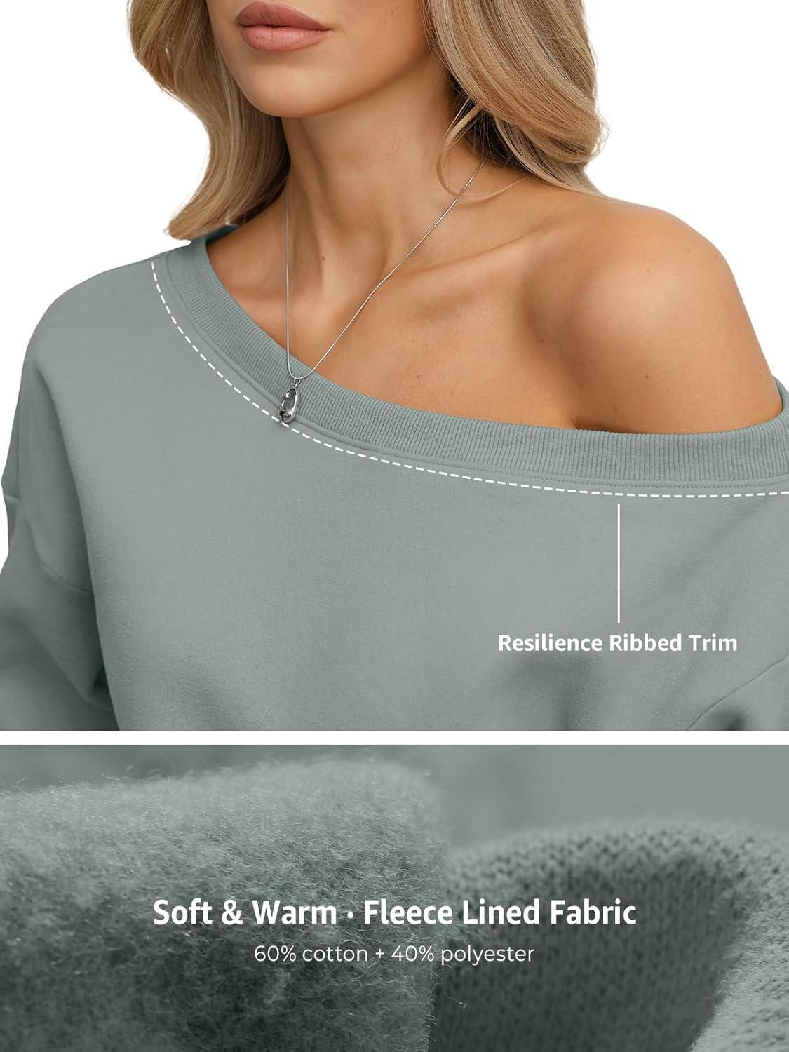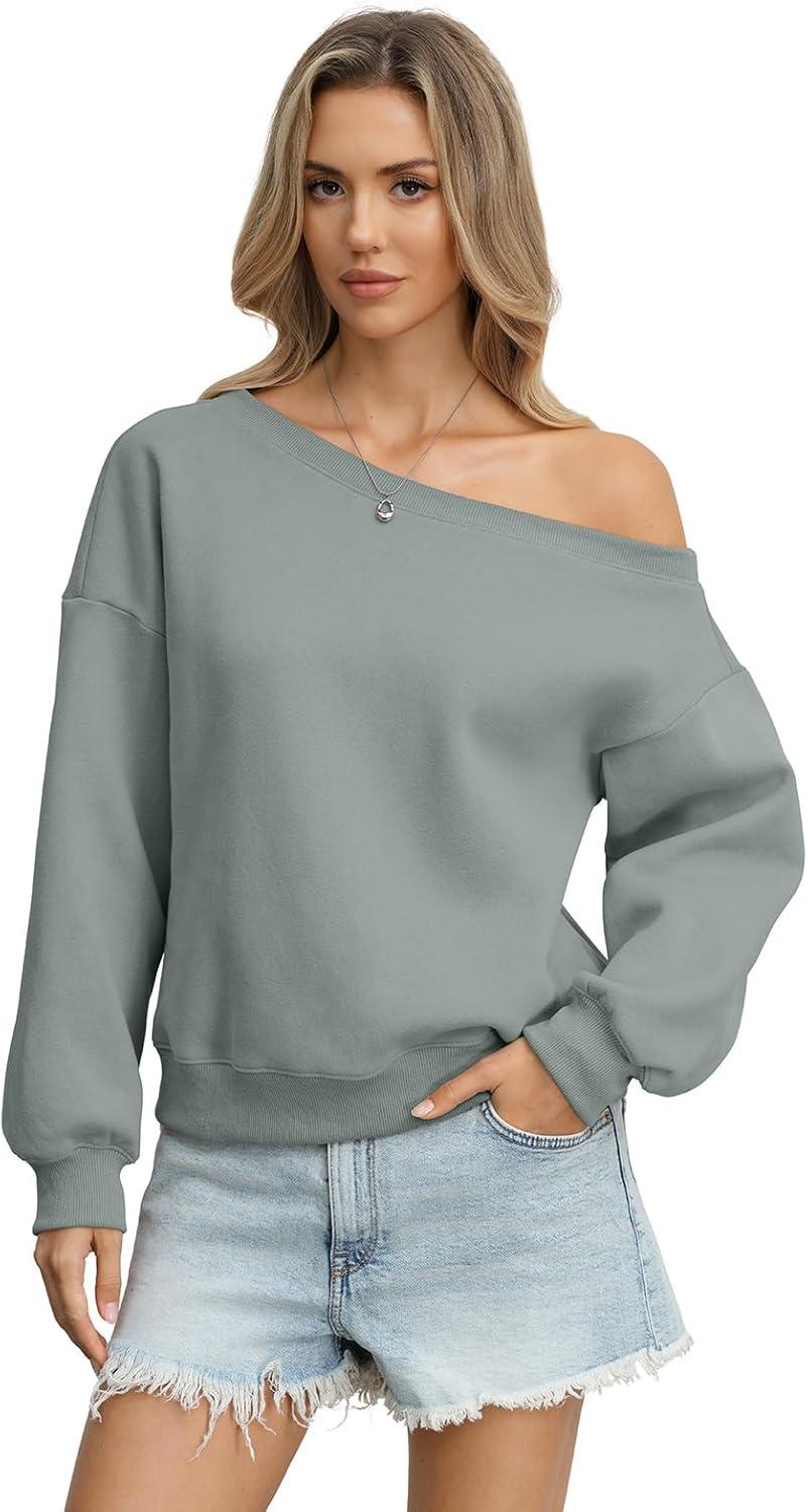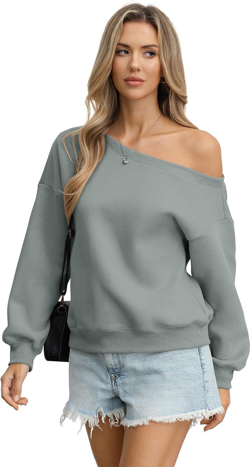 Womens Fleece Sweatshirts Oversized Off The Shoulder Pullover Tops Casual Long Sleeve Comfy Fall Outfits 2026(Dusty Green)
