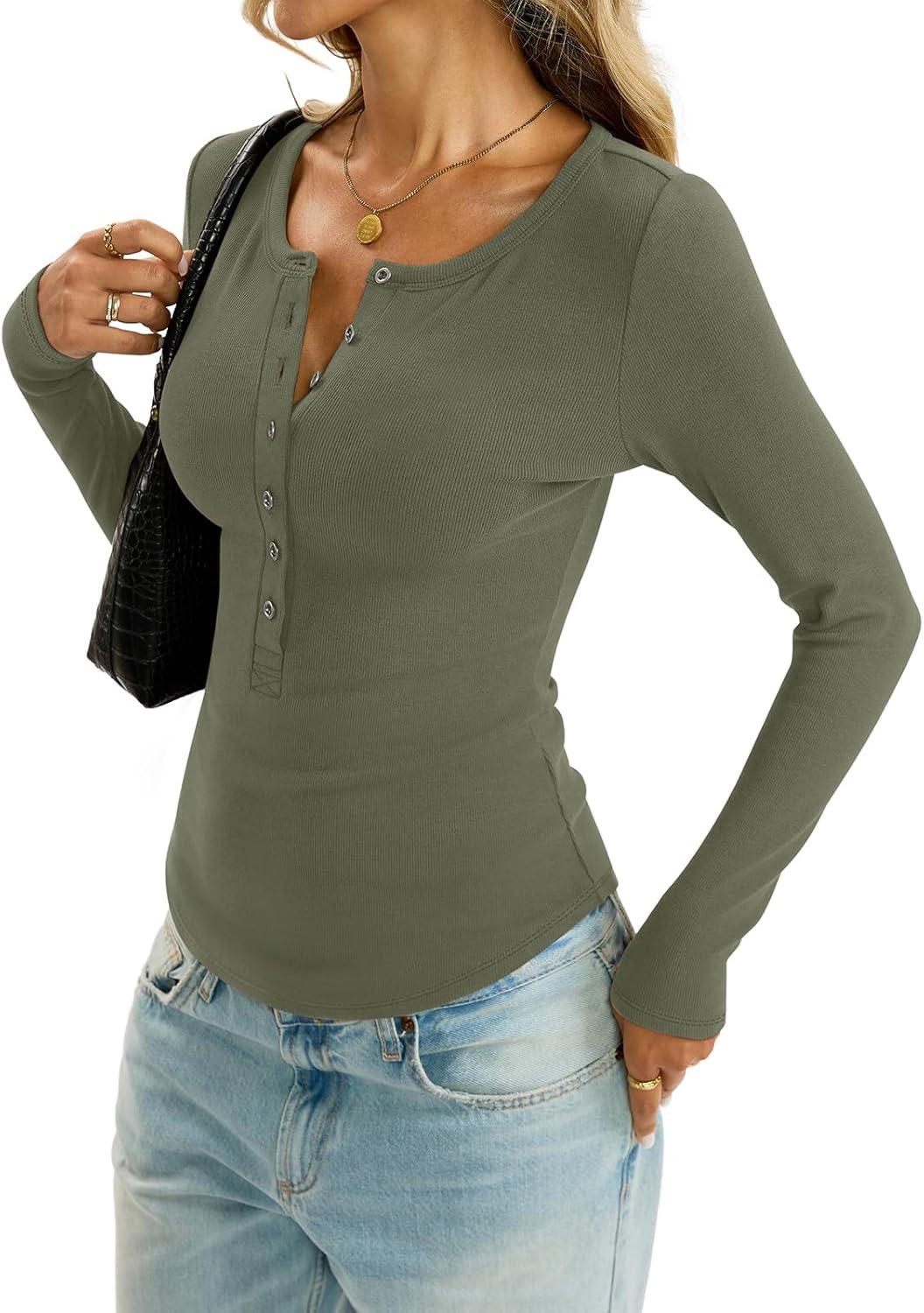 Womens Henley Long Sleeve Shirt Cotton Ribbed Crewneck Tops Sexy Button Down Tee Layering Basic Fitted T Shirts 2026(Green)