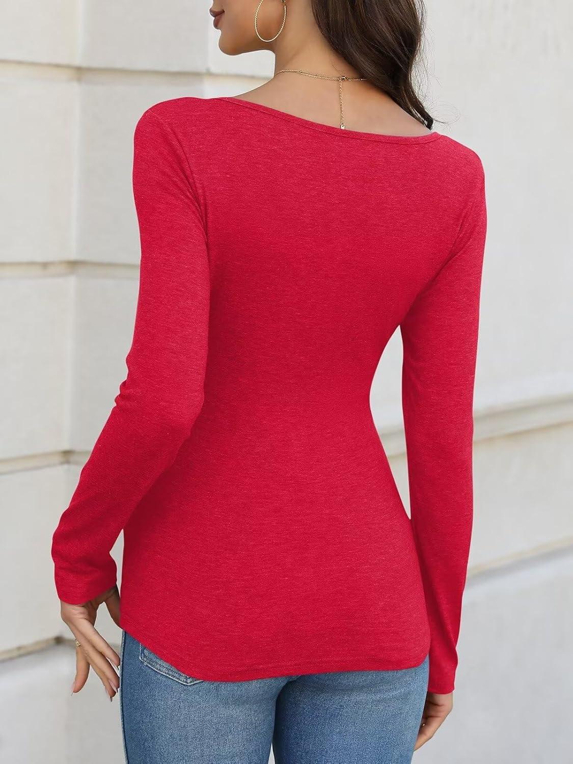 Women’s Long Sleeve Deep V Neck Tops Wrap Ruched Slim Fit Shirts Button Side Blouse Sexy Fall Outfits 2025(Red)