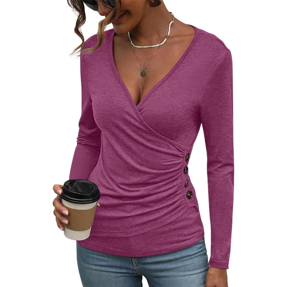 Women’s Long Sleeve Deep V Neck Tops Wrap Ruched Slim Fit Shirts Button Side Blouse Sexy Fall Outfits 2025(Rose Pink)