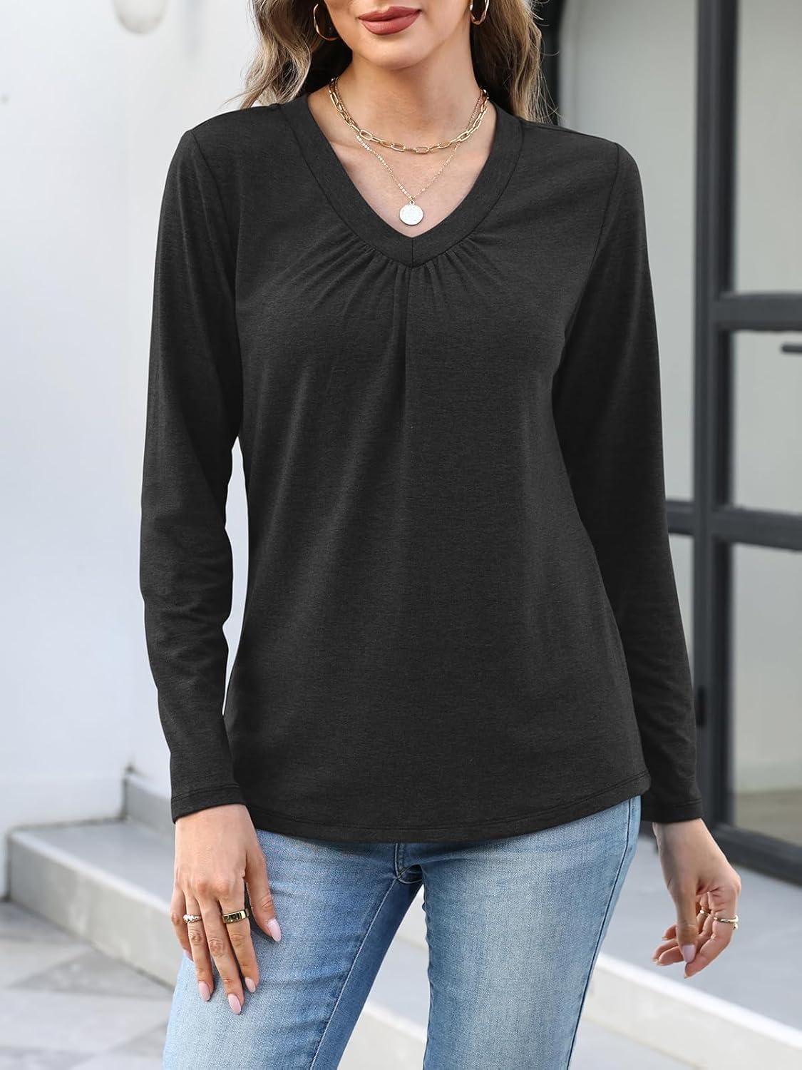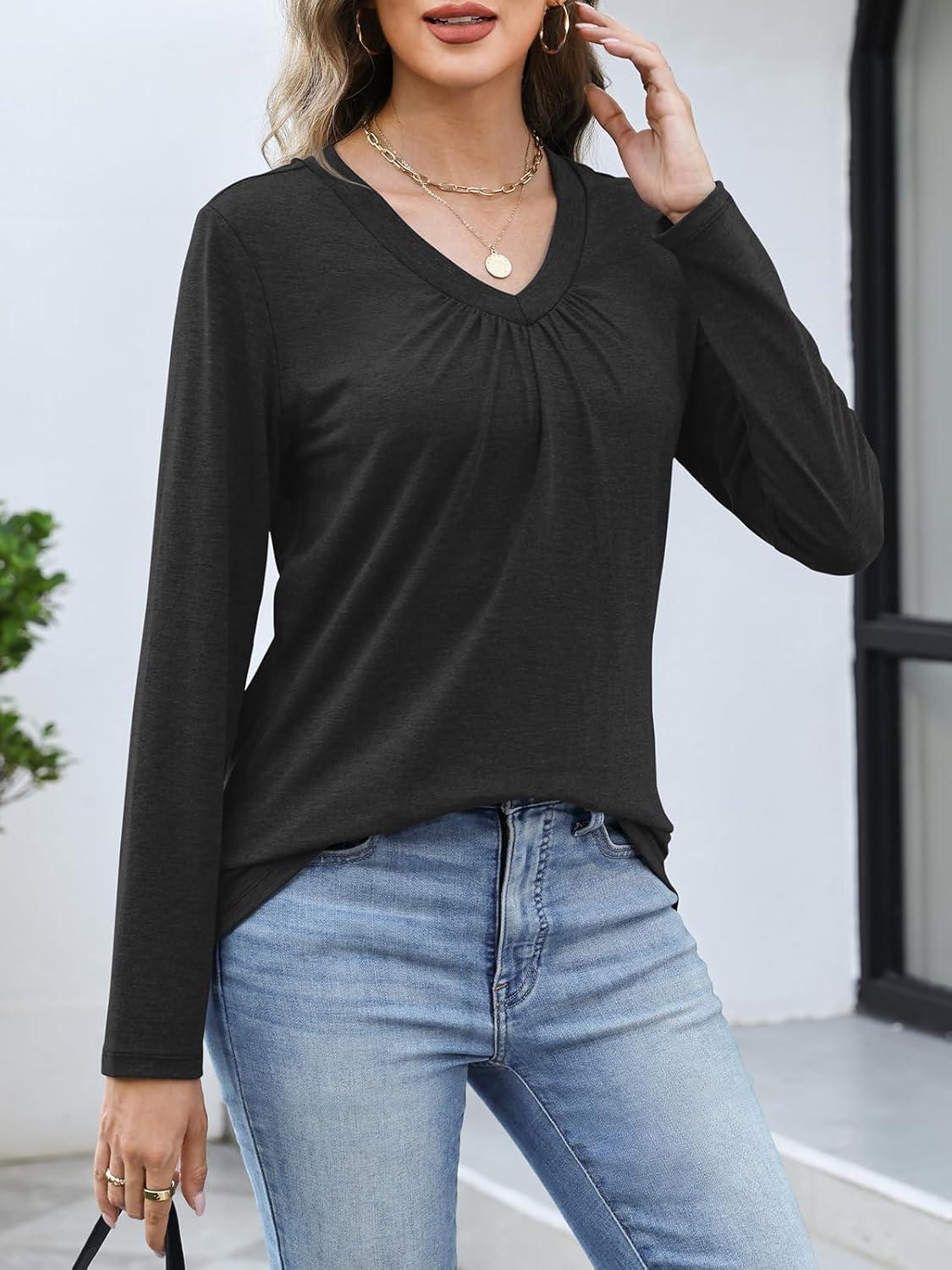 Womens Long Sleeve T Shirts V Neck Ruched Tops Loose Fit Pleated Tee Dressy Casual Tunic Blouses Fall Clothes(Black)