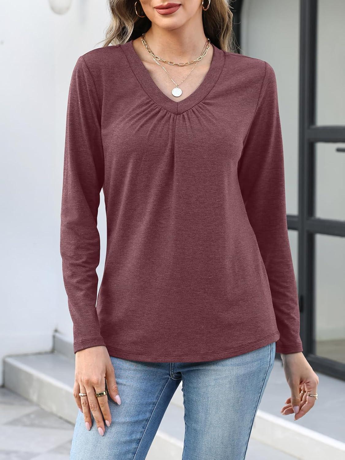 Womens Long Sleeve T Shirts V Neck Ruched Tops Loose Fit Pleated Tee Dressy Casual Tunic Blouses Fall Clothes(Burgundy)