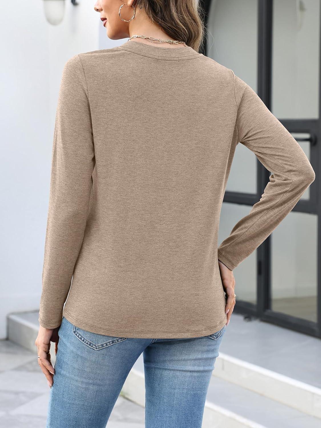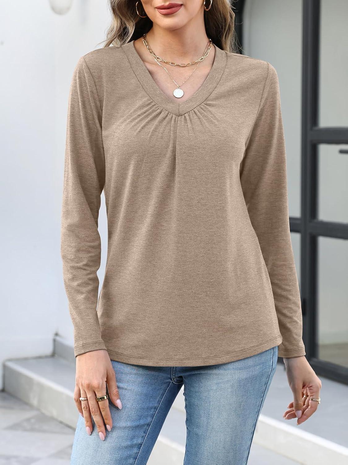 Womens Long Sleeve T Shirts V Neck Ruched Tops Loose Fit Pleated Tee Dressy Casual Tunic Blouses Fall Clothes(Khaki)