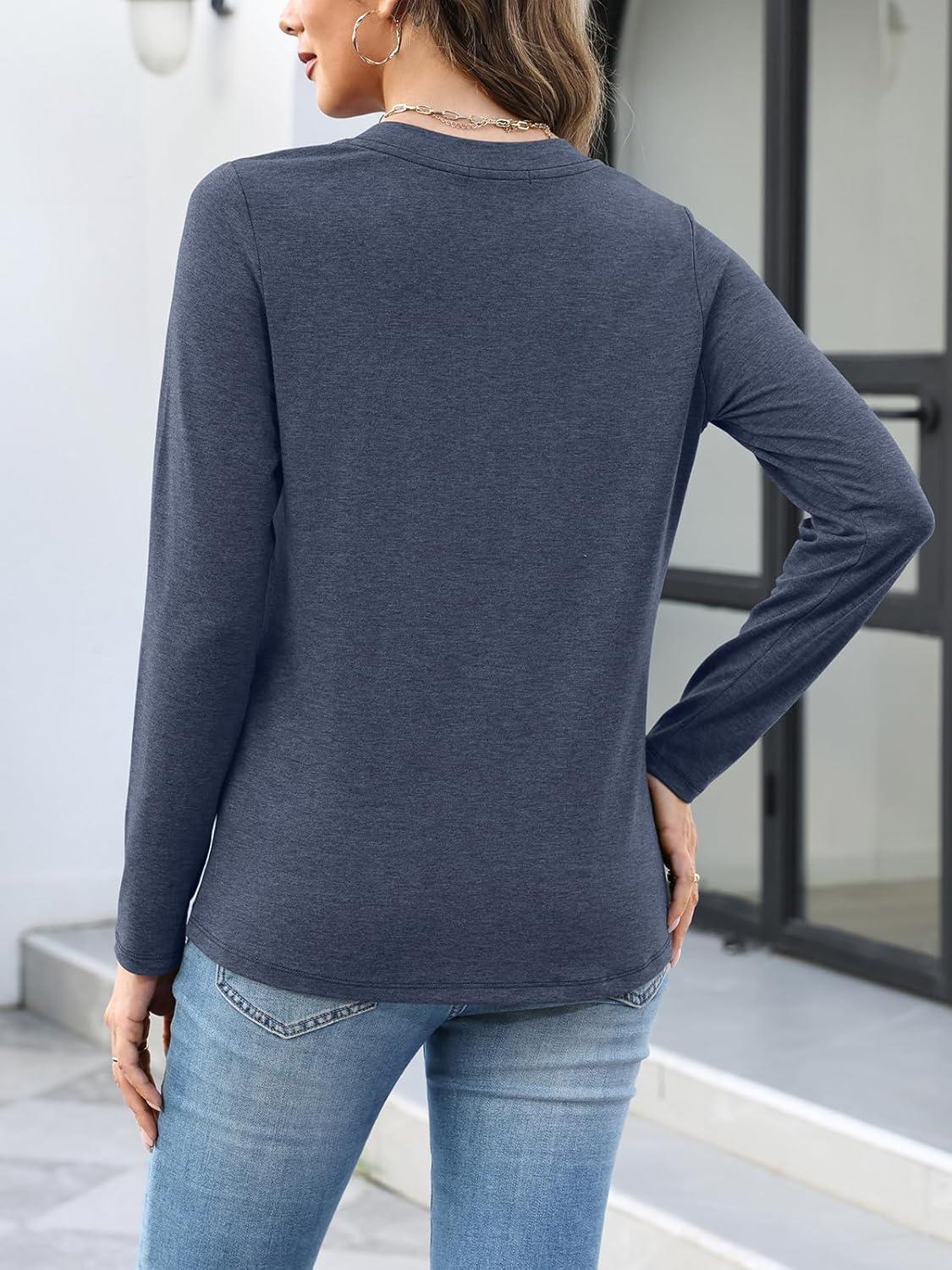 Womens Long Sleeve T Shirts V Neck Ruched Tops Loose Fit Pleated Tee Dressy Casual Tunic Blouses Fall Clothes(Navy Blue)