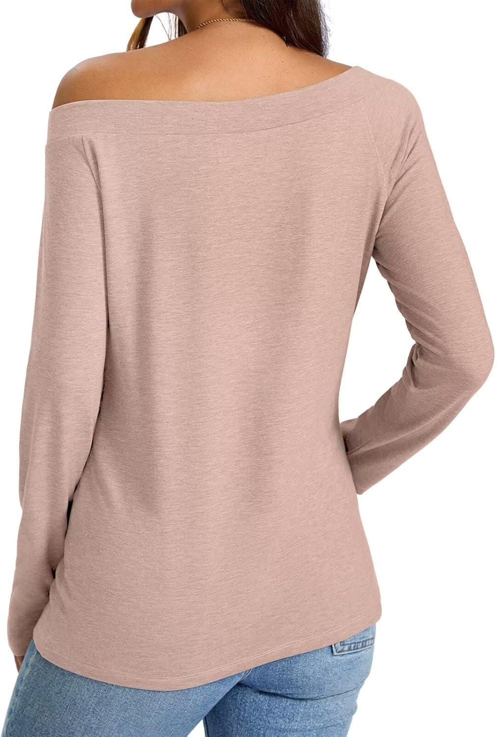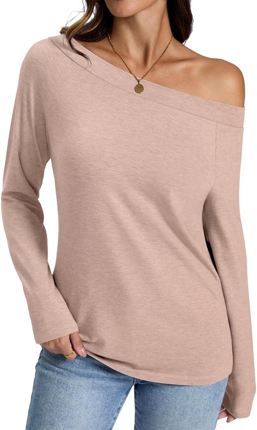 Womens Off Shoulder Tops Long Sleeve Shirts Sexy Tops Casual Loose Fit Tee Going Out Fashion Clothes 2025(Apricot)