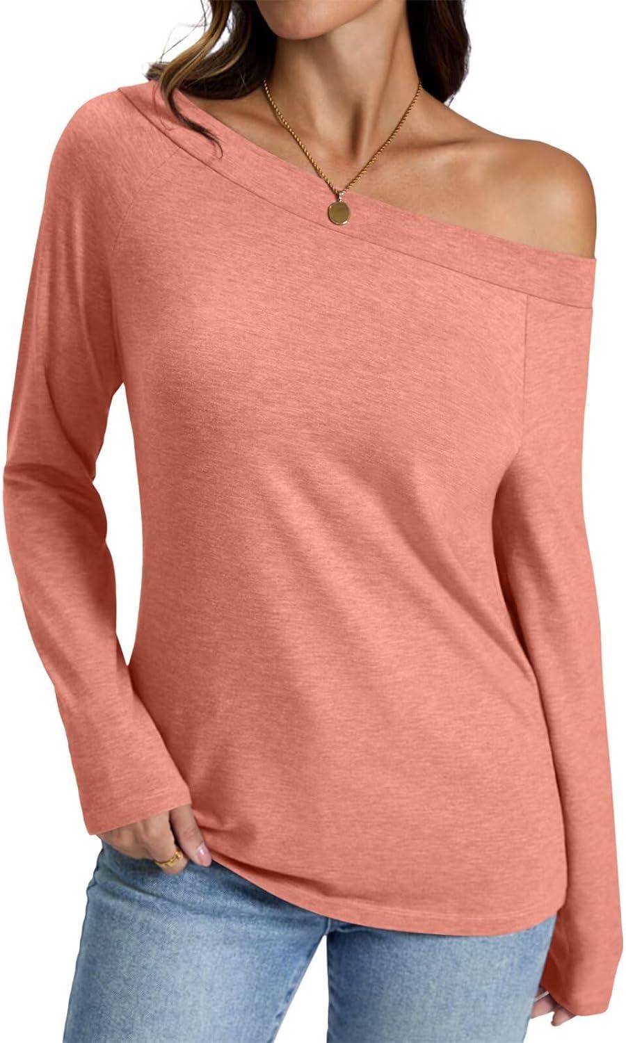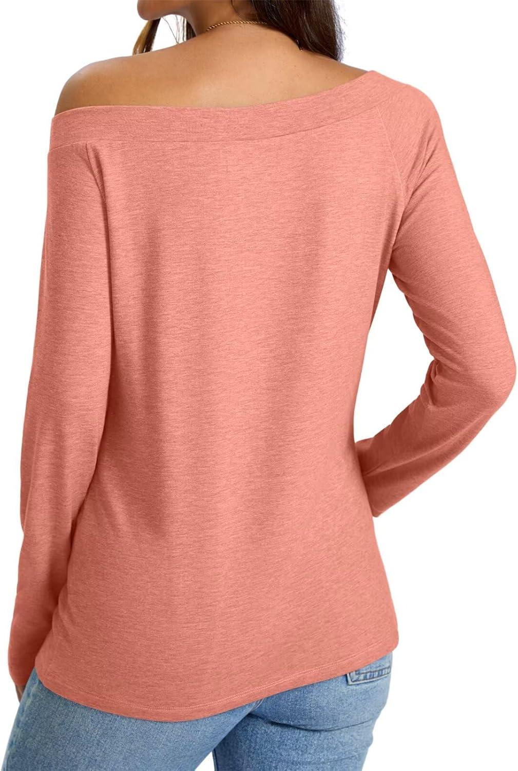 Womens Off Shoulder Tops Long Sleeve Shirts Sexy Tops Casual Loose Fit Tee Going Out Fashion Clothes 2025(Pink)