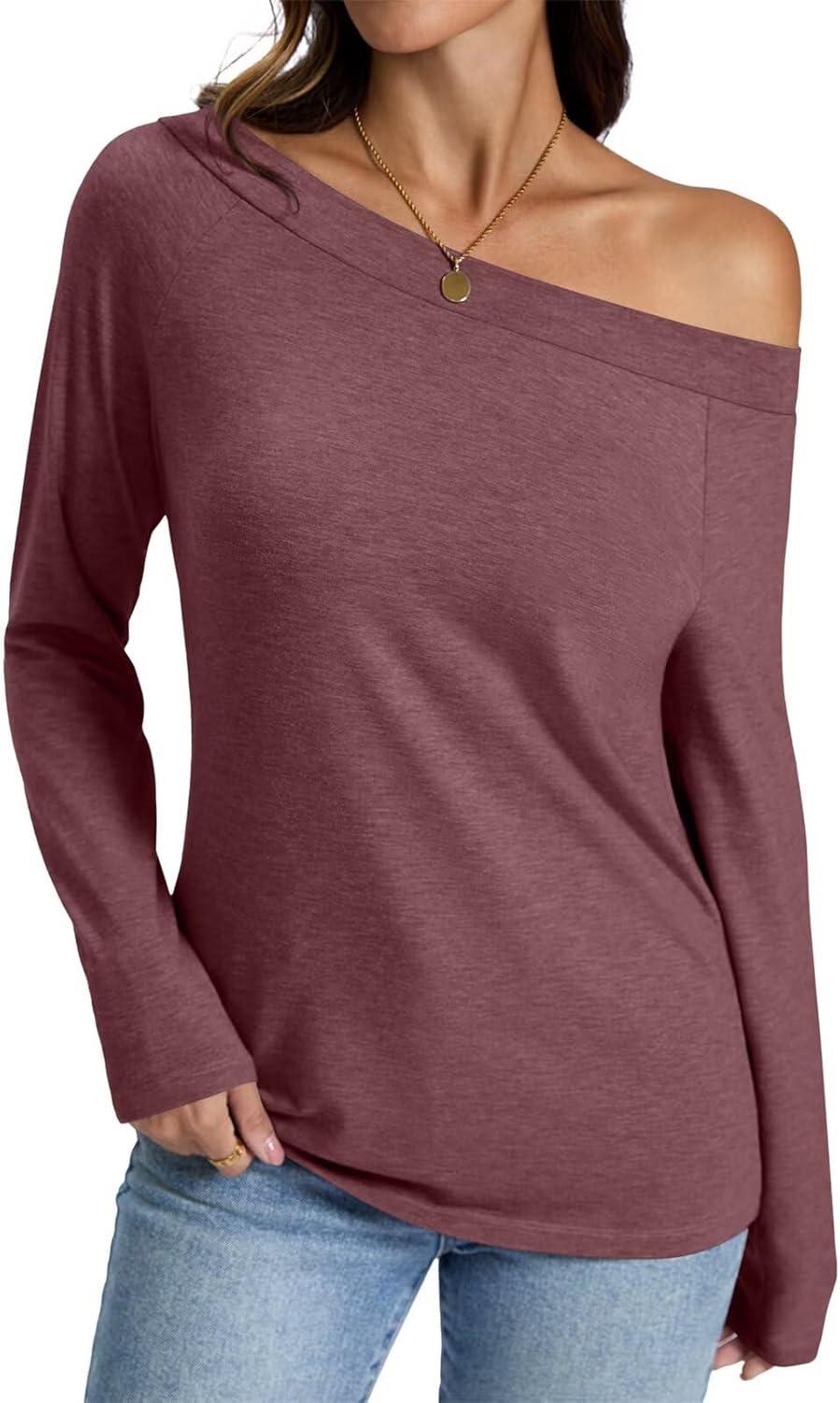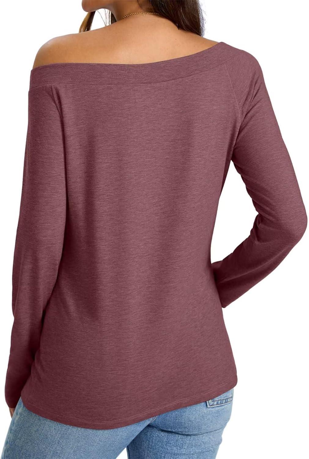 Womens Off Shoulder Tops Long Sleeve Shirts Sexy Tops Casual Loose Fit Tee Going Out Fashion Clothes 2025(Wine Red)