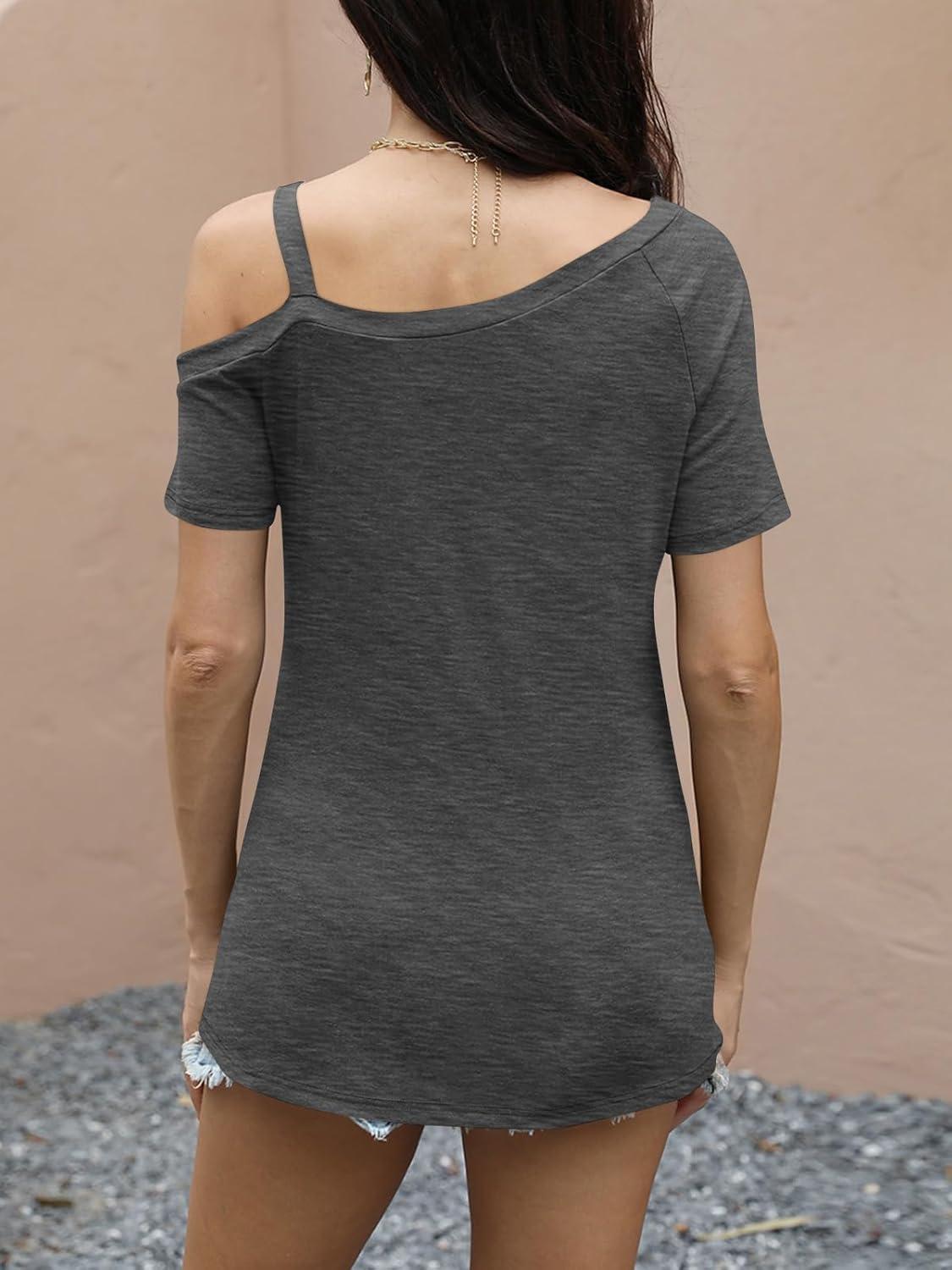 Womens Off Shoulder Tops Summer Asymmetrical Shirts Short Sleeve Button Ruched Blouses 2025(Dark Grey)