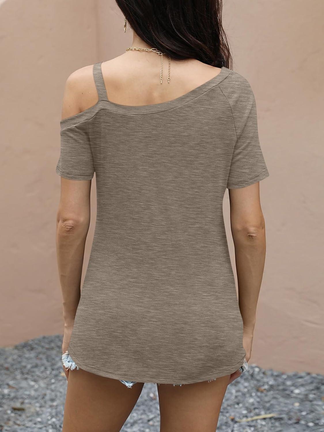 Womens Off Shoulder Tops Summer Asymmetrical Shirts Short Sleeve Button Ruched Blouses 2025(Khaki)