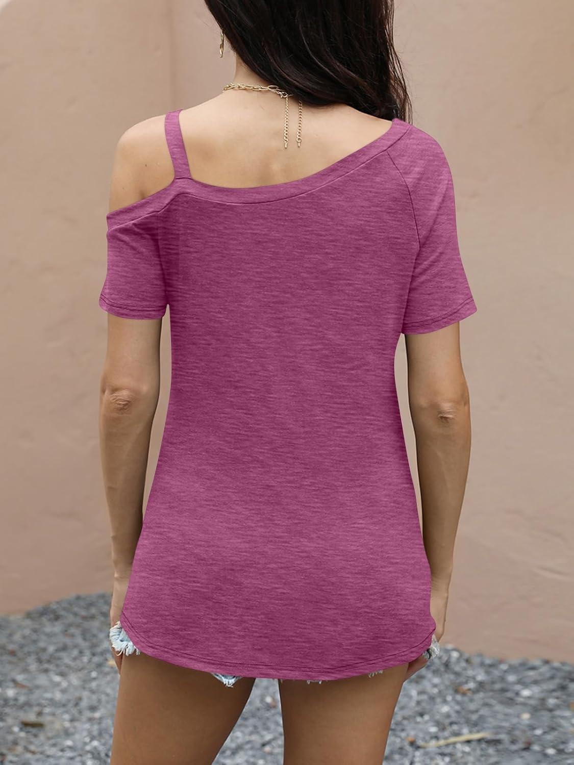 Womens Off Shoulder Tops Summer Asymmetrical Shirts Short Sleeve Button Ruched Blouses 2025(Rose Pink)