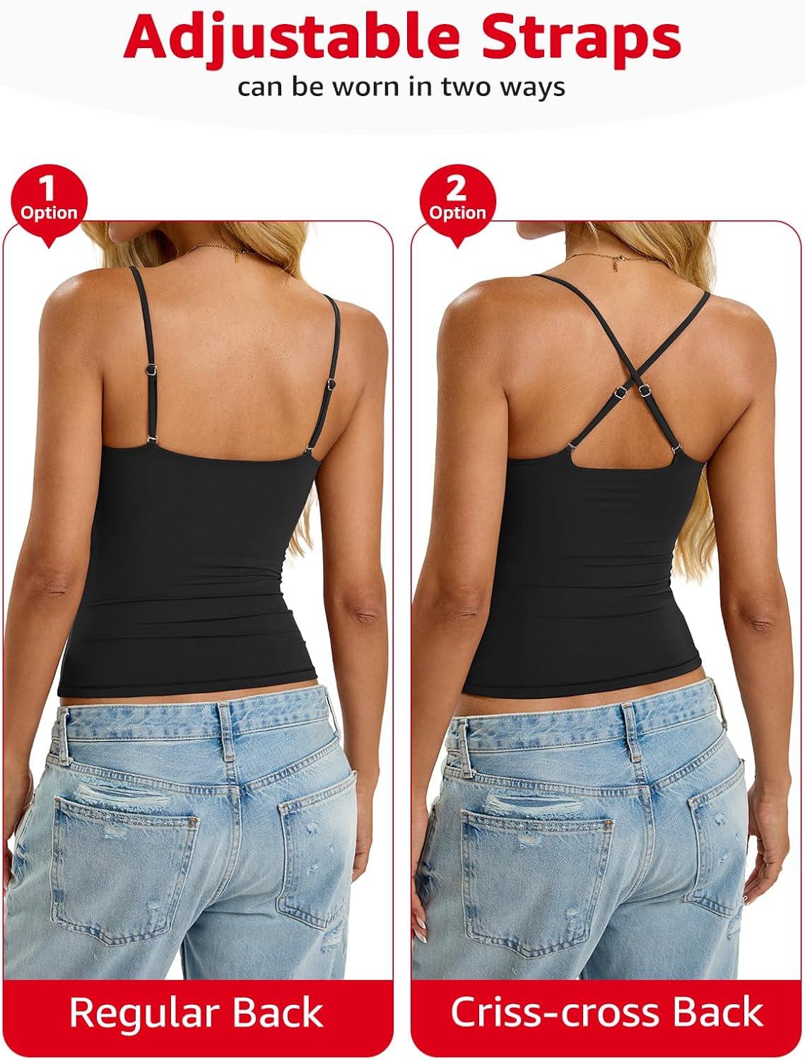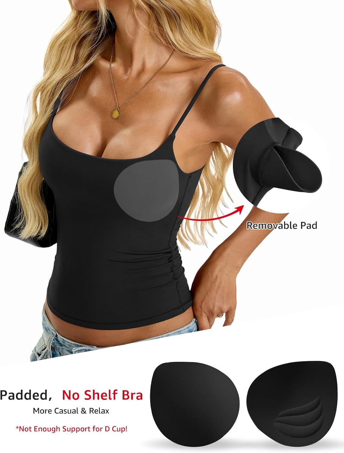 Womens Padded Cami Tank Tops Double Lined Spaghetti Strap Built in Bra Shirts Slim Fitted Basic Summer Cloth 2025(Black)