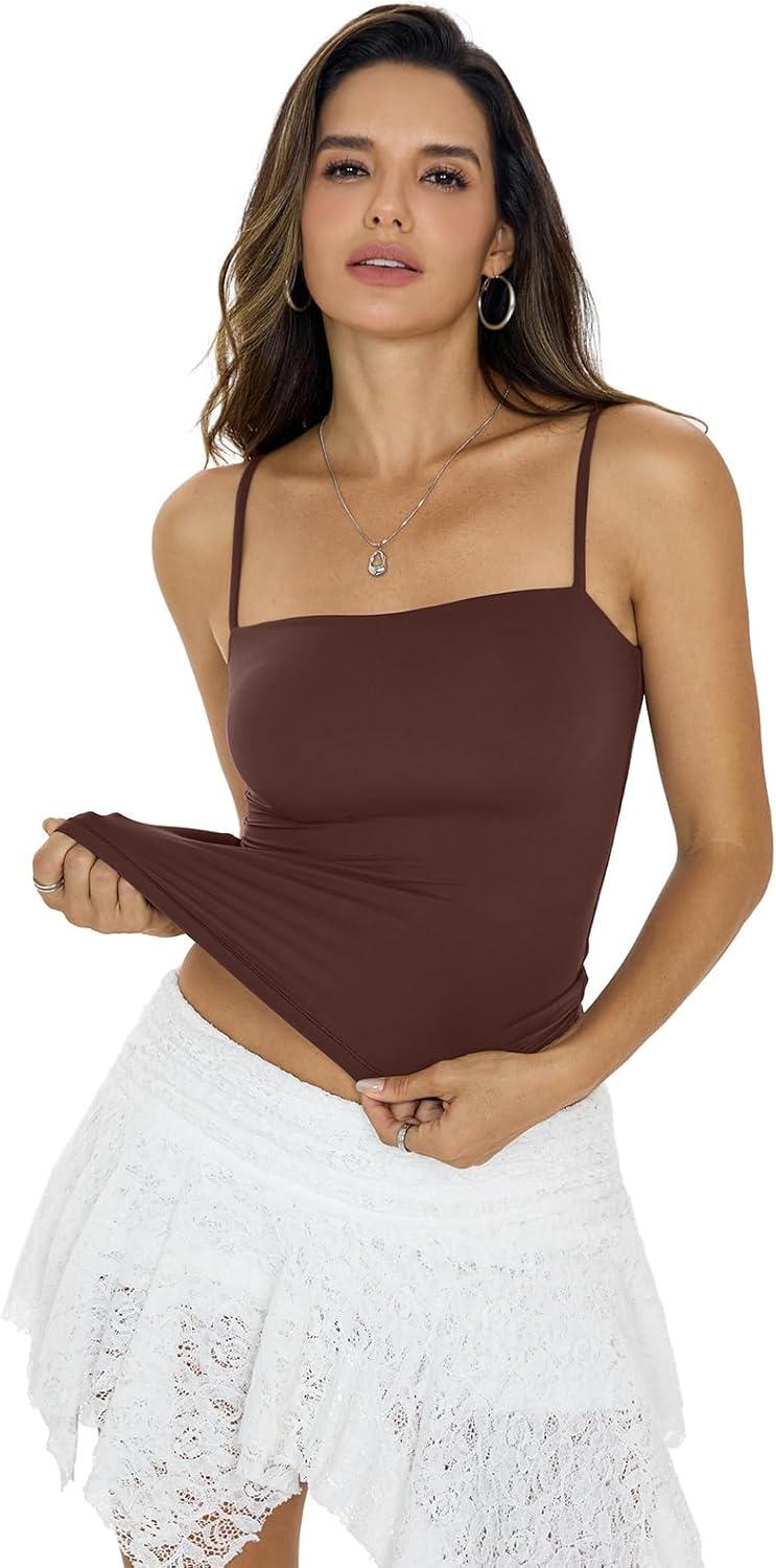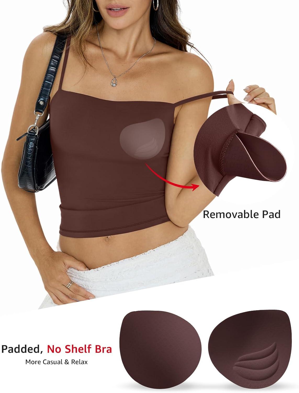 Womens Padded Double Lined Crop Tank Tops Square Neck Built in Bra Tops Adjustable Spaghetti Strap Cami Shirts(Brown)