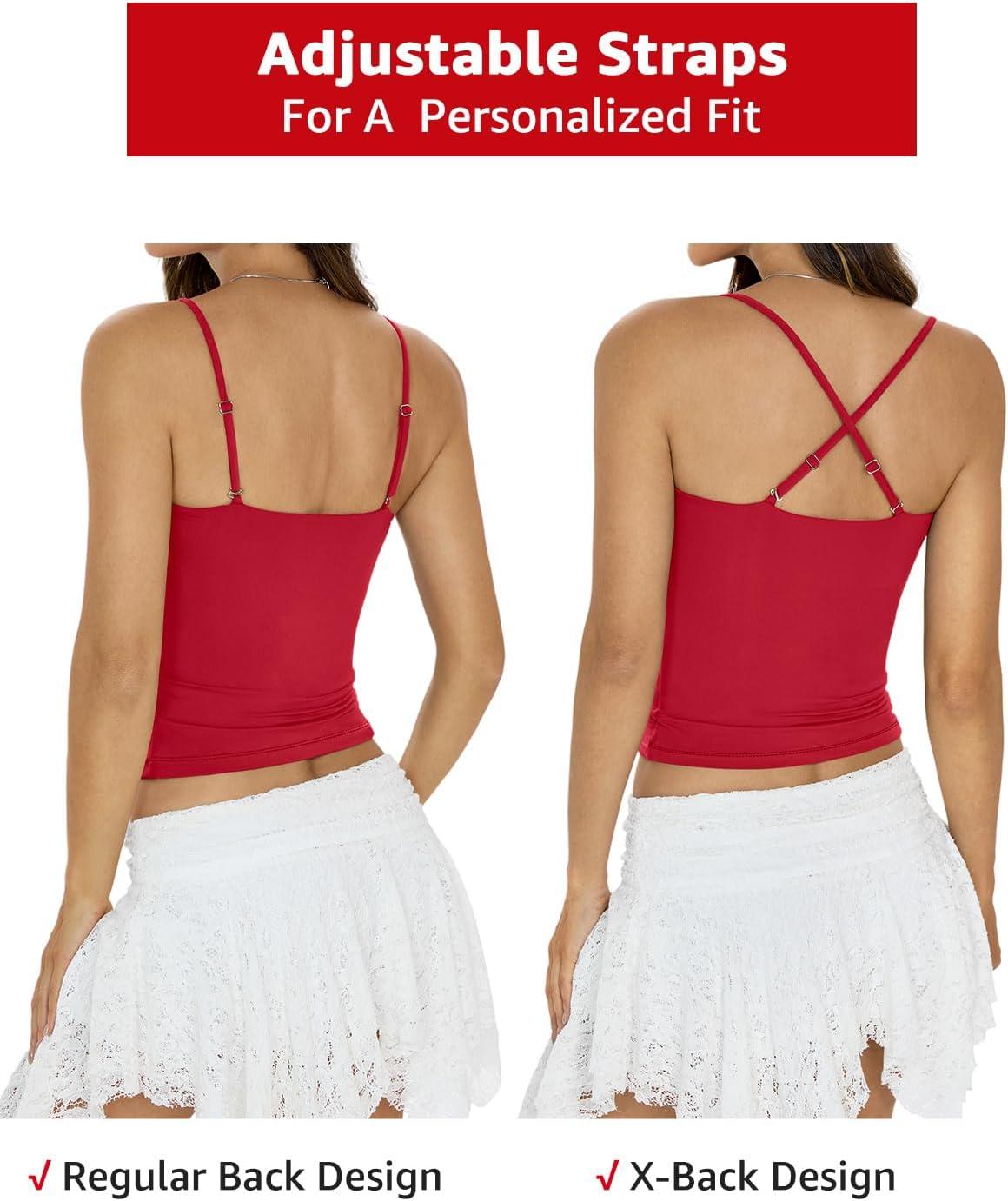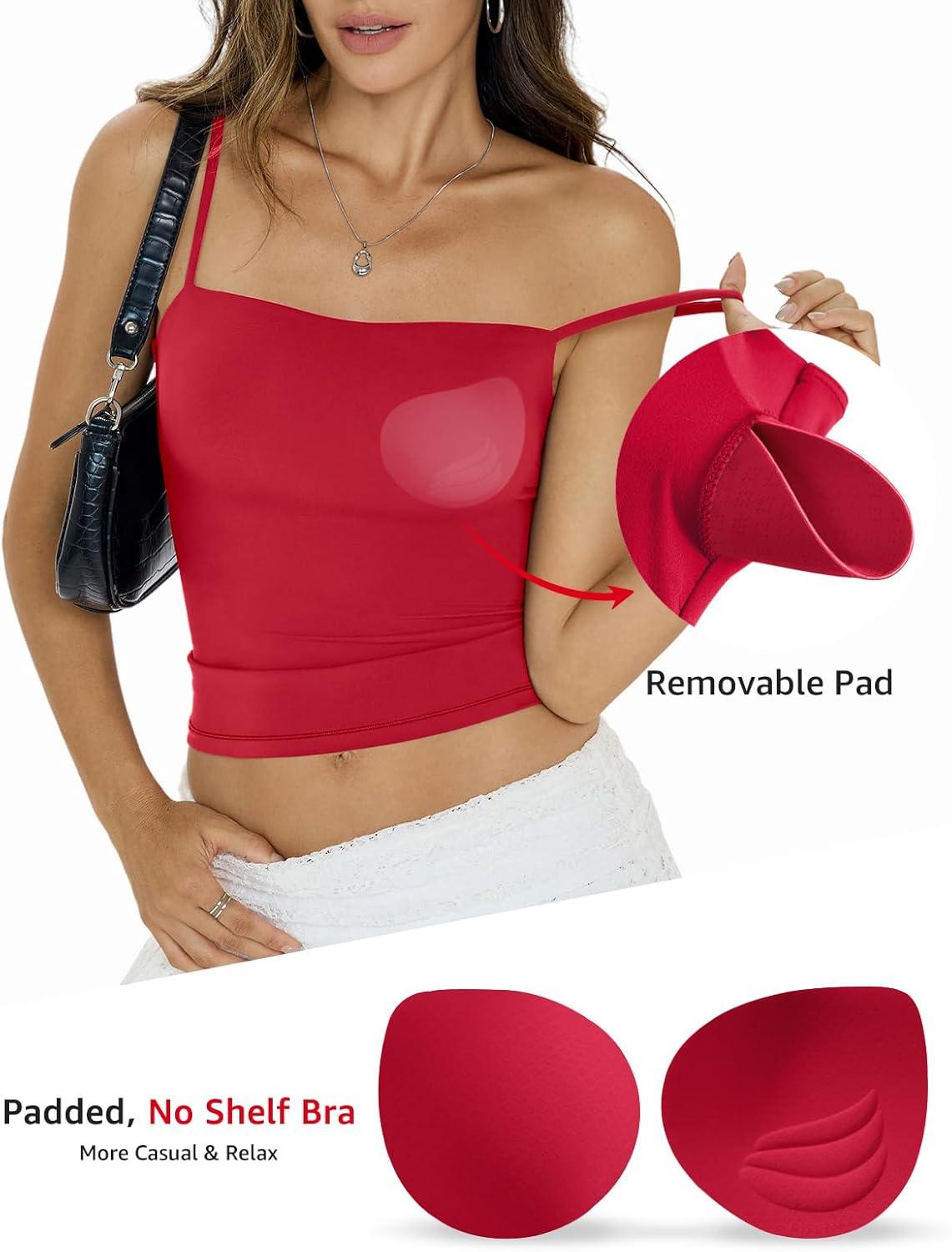 Womens Padded Double Lined Crop Tank Tops Square Neck Built in Bra Tops Adjustable Spaghetti Strap Cami Shirts(Red)