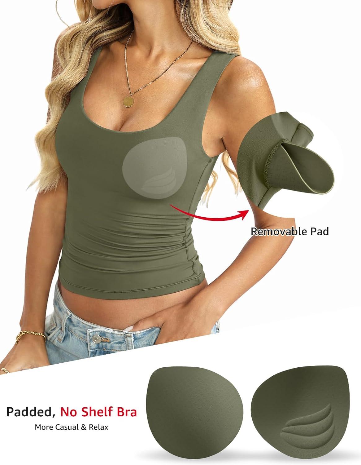 Padded, No Shelf Bra: This built in bra tops with removable pads design, you can wear it with or without the pads. The padded tank tops provide light support, ideal for C-cups and smaller