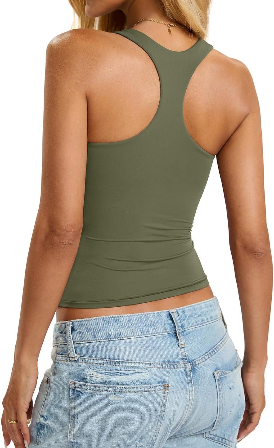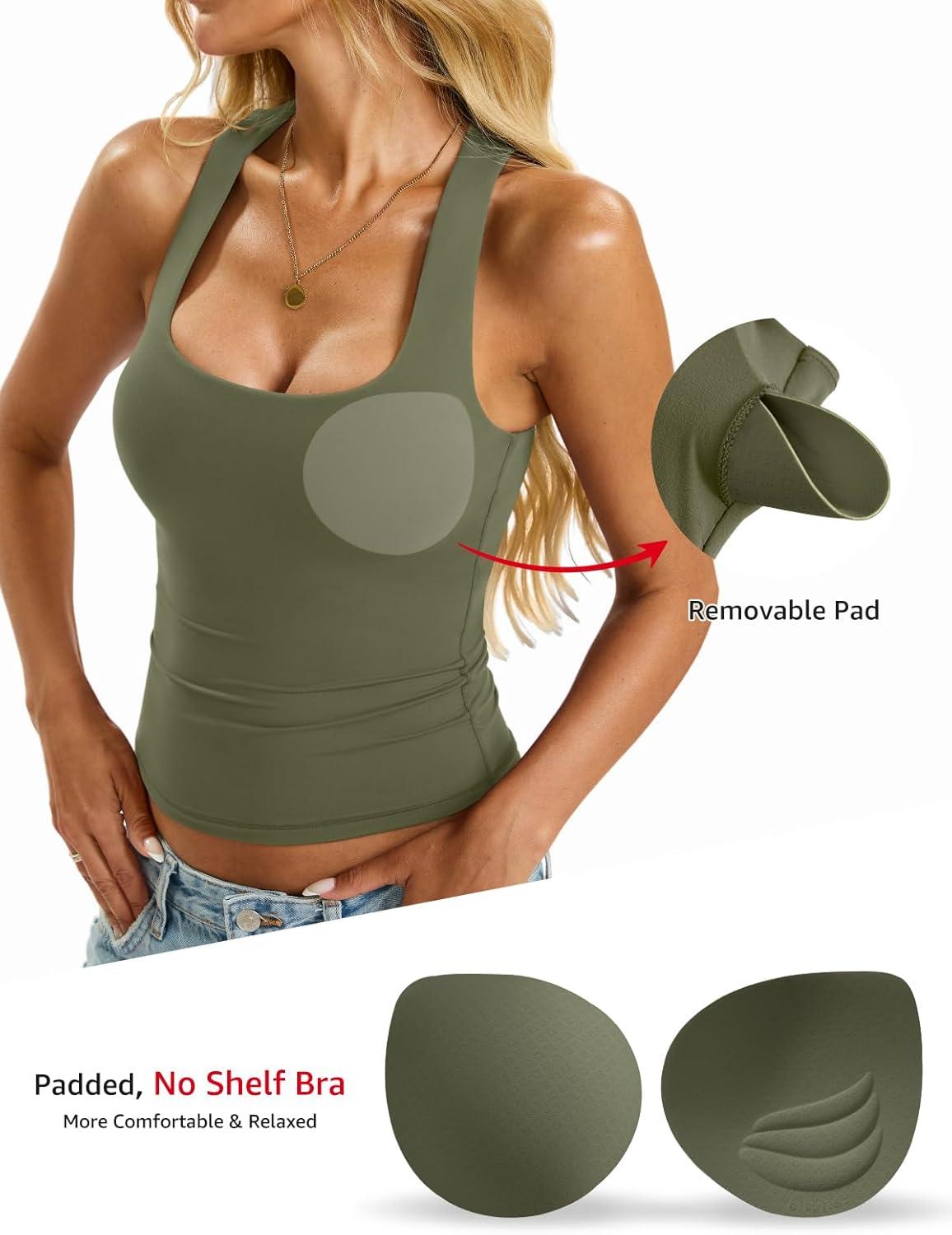 Womens Padded Racerback Tank Tops Double Lined Built in Bra Cami Tops Basic Fitted Shirts Summer Going Out Tops(Army Green)