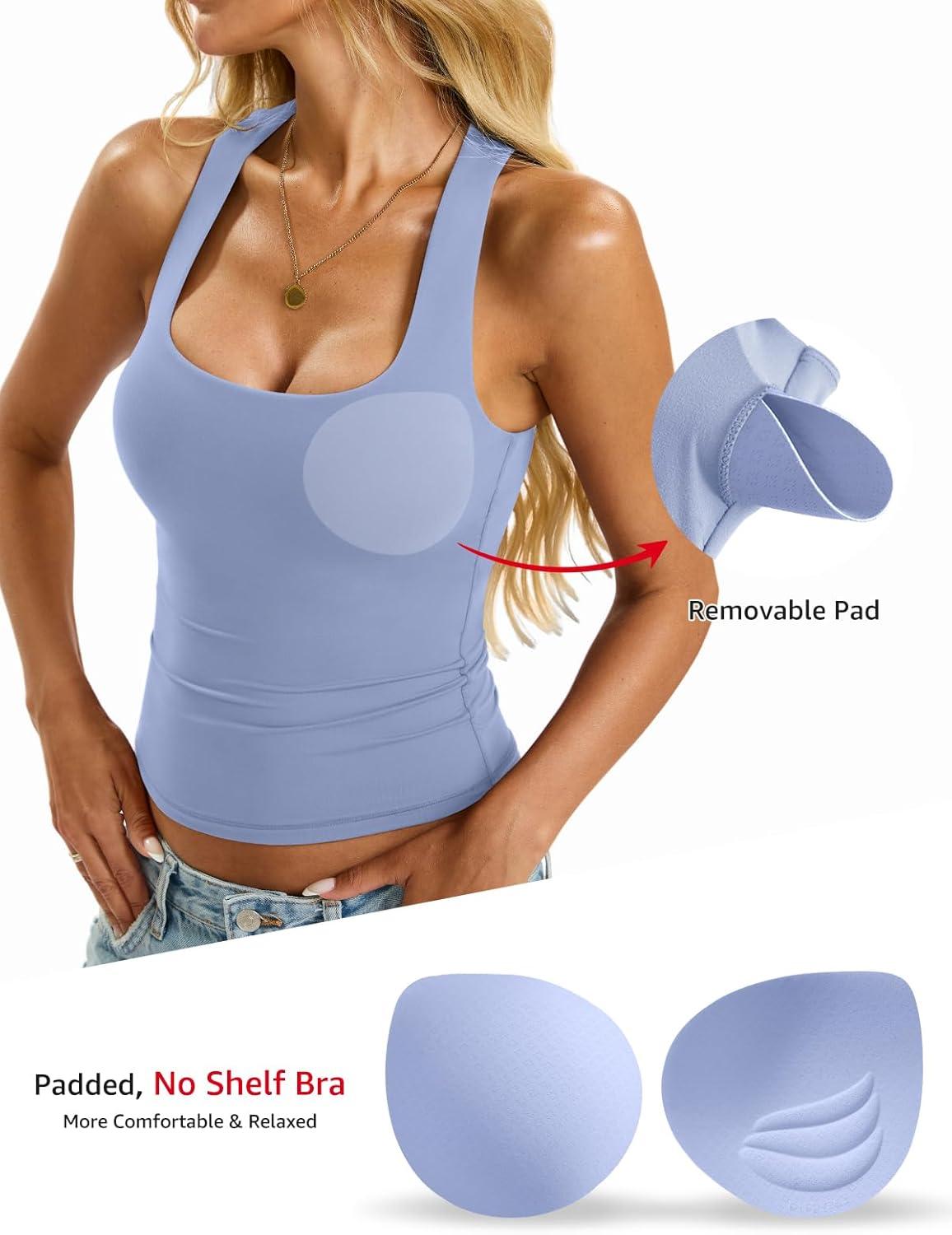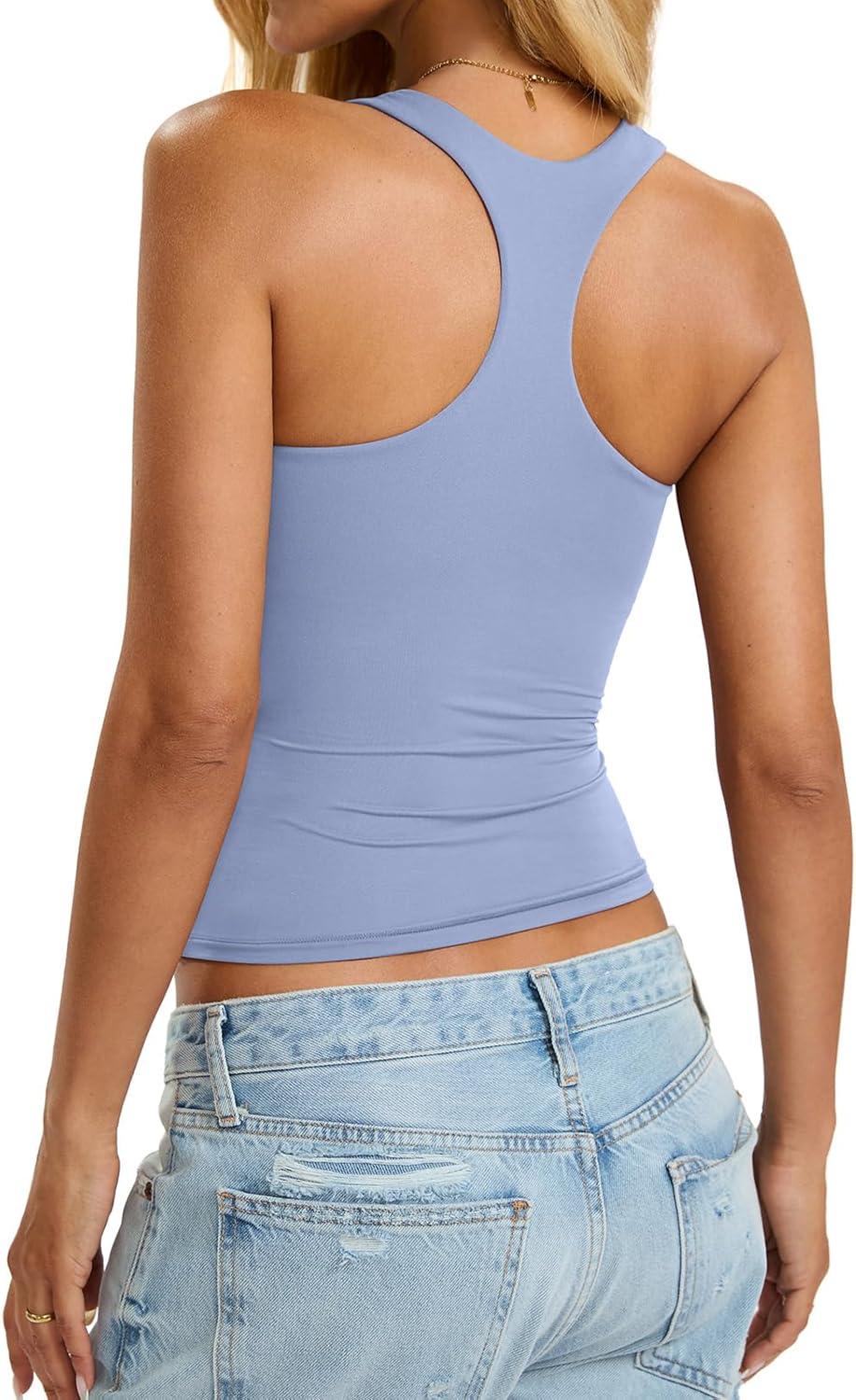 Womens Padded Racerback Tank Tops Double Lined Built in Bra Cami Tops Basic Fitted Shirts Summer Going Out Tops(Light Blue)