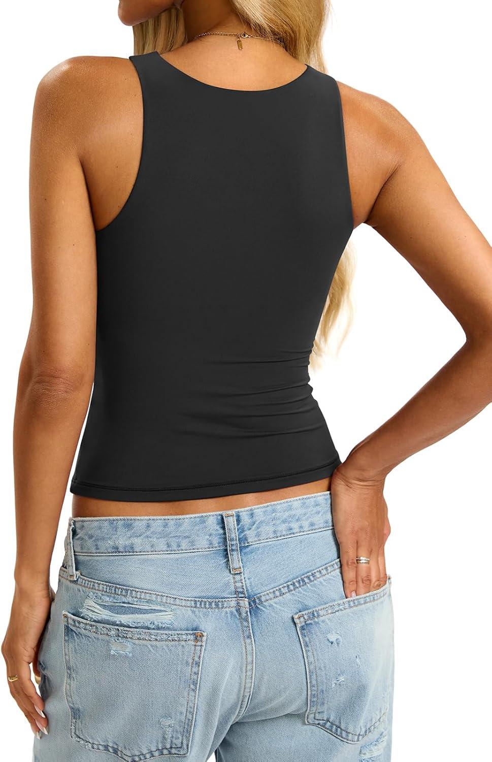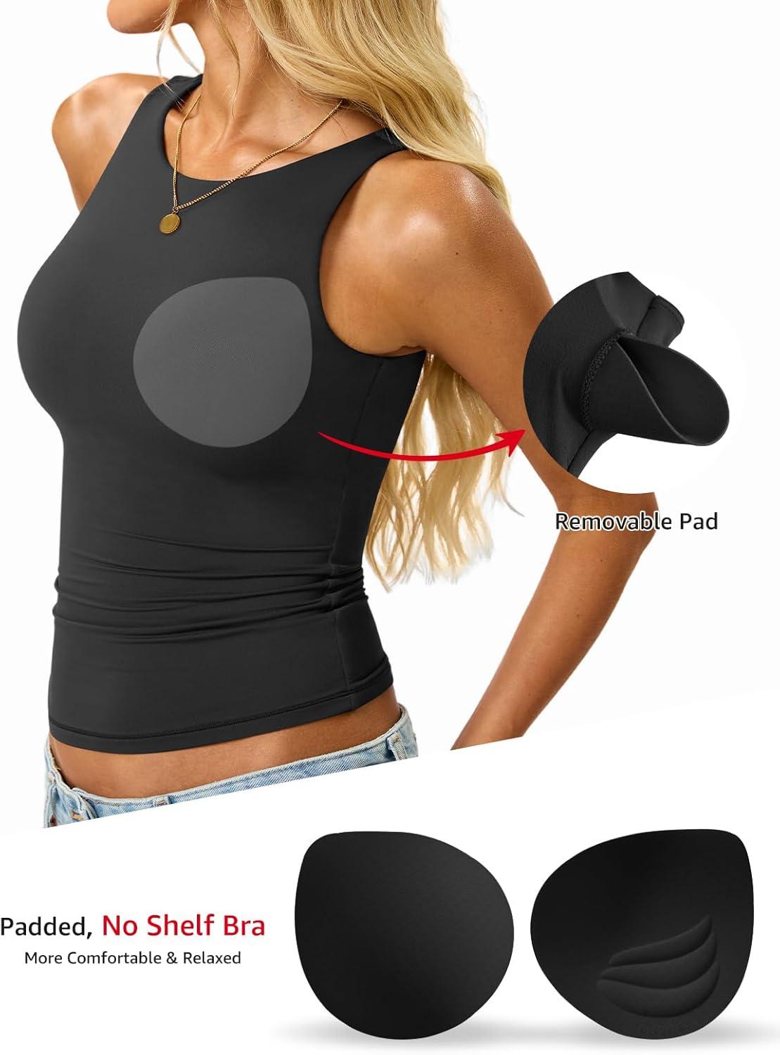 Womens Padded Tank Tops Built in Bra Double Lined High Neck Shirts Basic Slim Fitted Summer Going Out Top(Black)