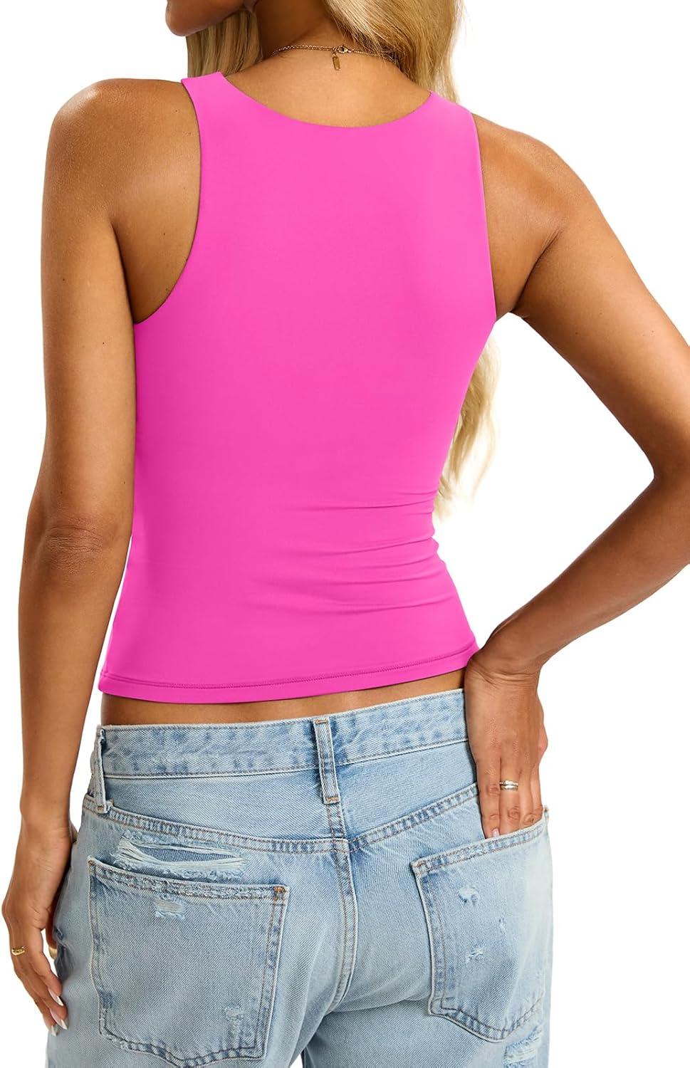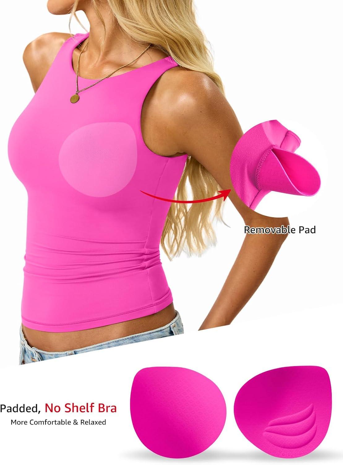 Womens Padded Tank Tops Built in Bra Double Lined High Neck Shirts Basic Slim Fitted Summer Going Out Top(Fluorescent Pink)