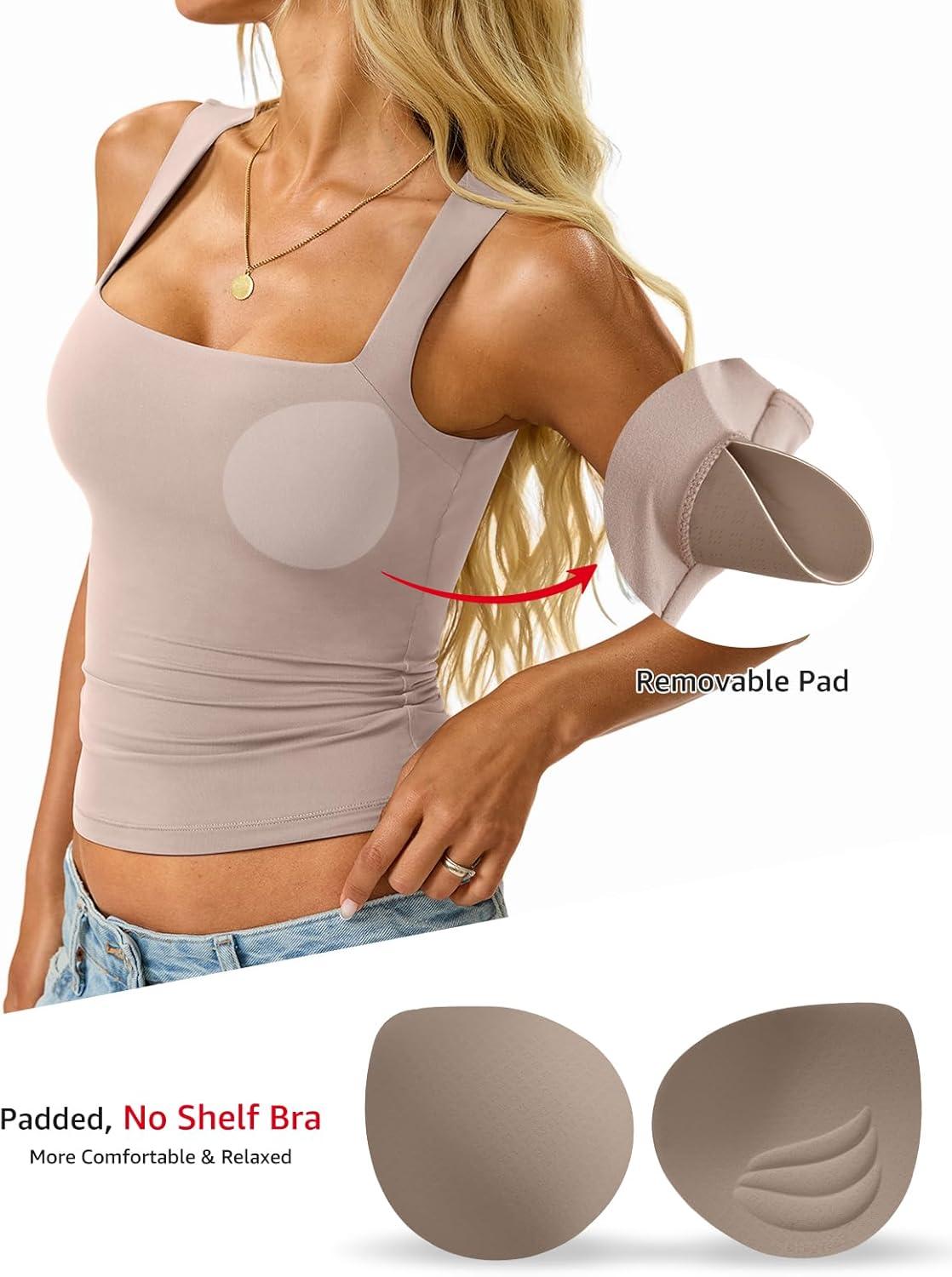 Womens Padded Tank Tops Double Lined Built in Bra Sleeveless Top Square Neck Slim Fitted Summer T Shirts 2025(Apricot)