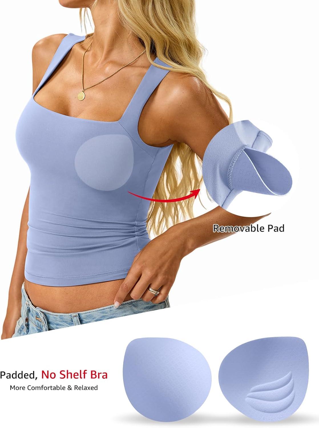 Womens Padded Tank Tops Double Lined Built in Bra Sleeveless Top Square Neck Slim Fitted Summer T Shirts 2025(Light Blue)