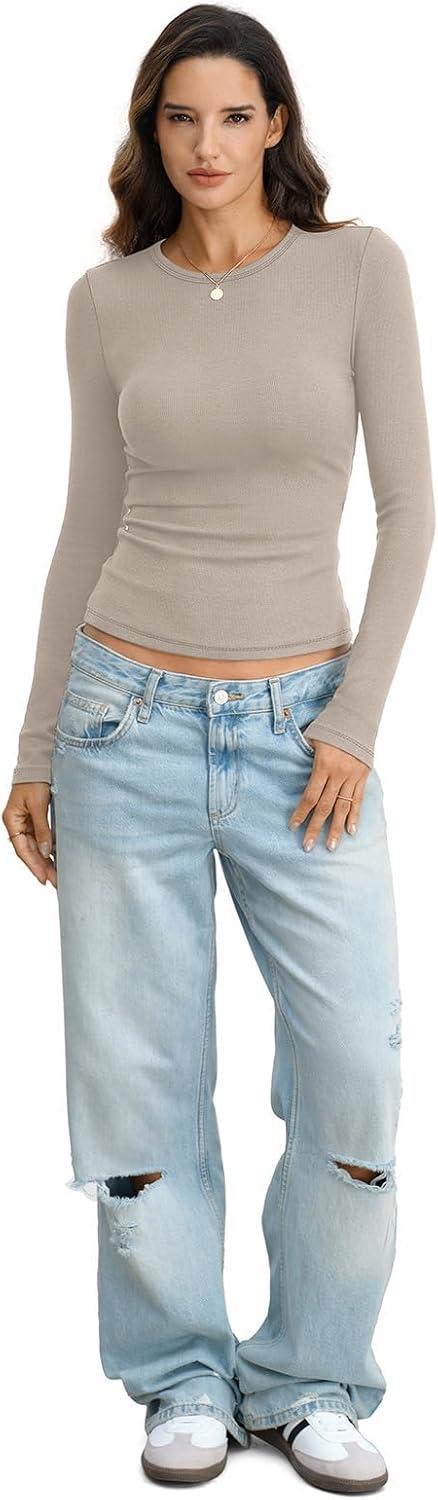 Womens Ribbed Cotton Long Sleeve Shirts Basic Crewneck Tee Slim Fit Going Out Tops Underscrub Fall Fashion 2026(Kahki)