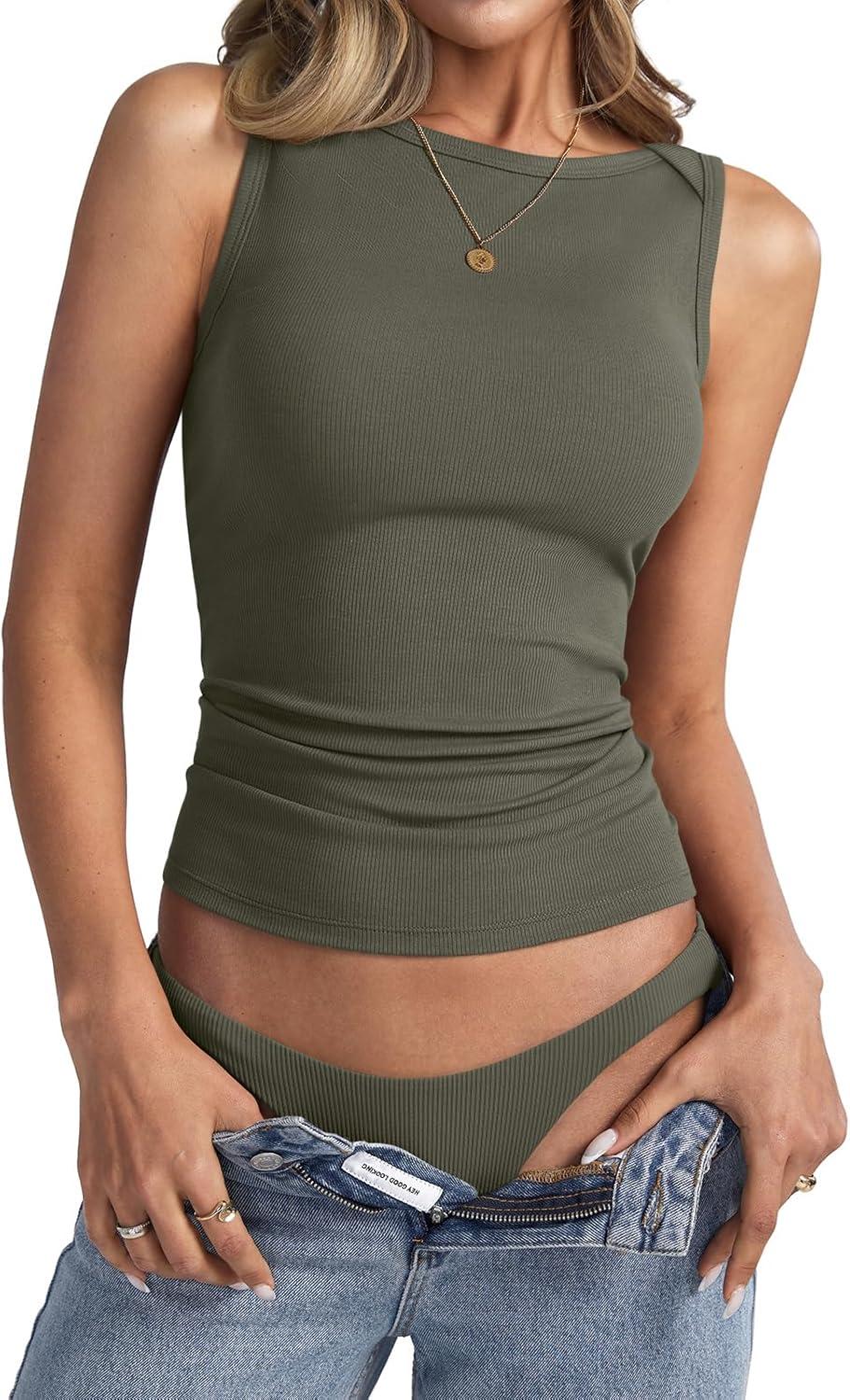Womens Sleeveless Ribbed Tank Tops Boat Neck Slim Fit Shirts Summer Beach Vacation Clothes(Army Green)