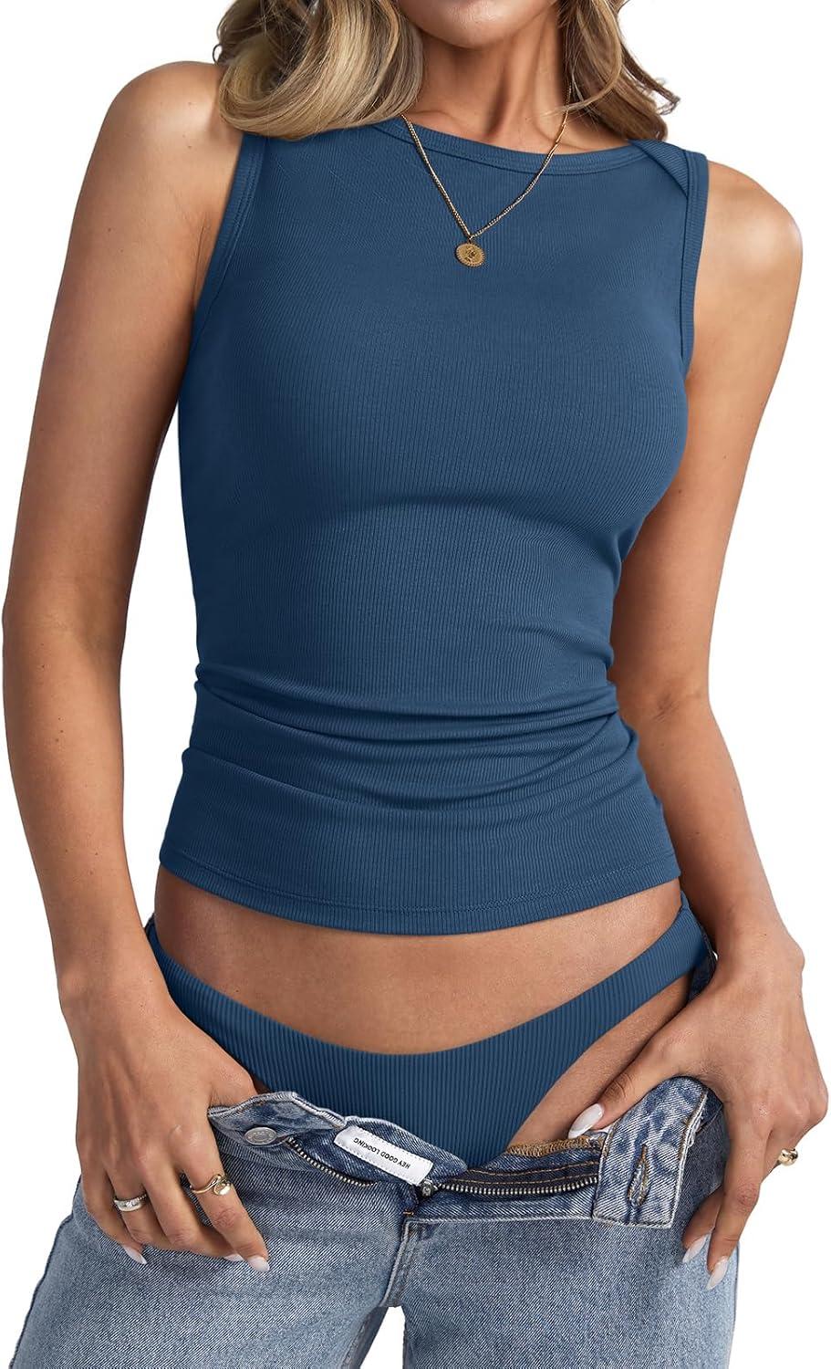 Womens Sleeveless Ribbed Tank Tops Boat Neck Slim Fit Shirts Summer Beach Vacation Clothes(Dark Blue)