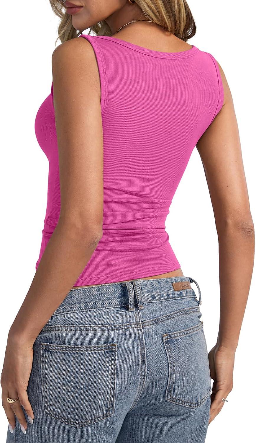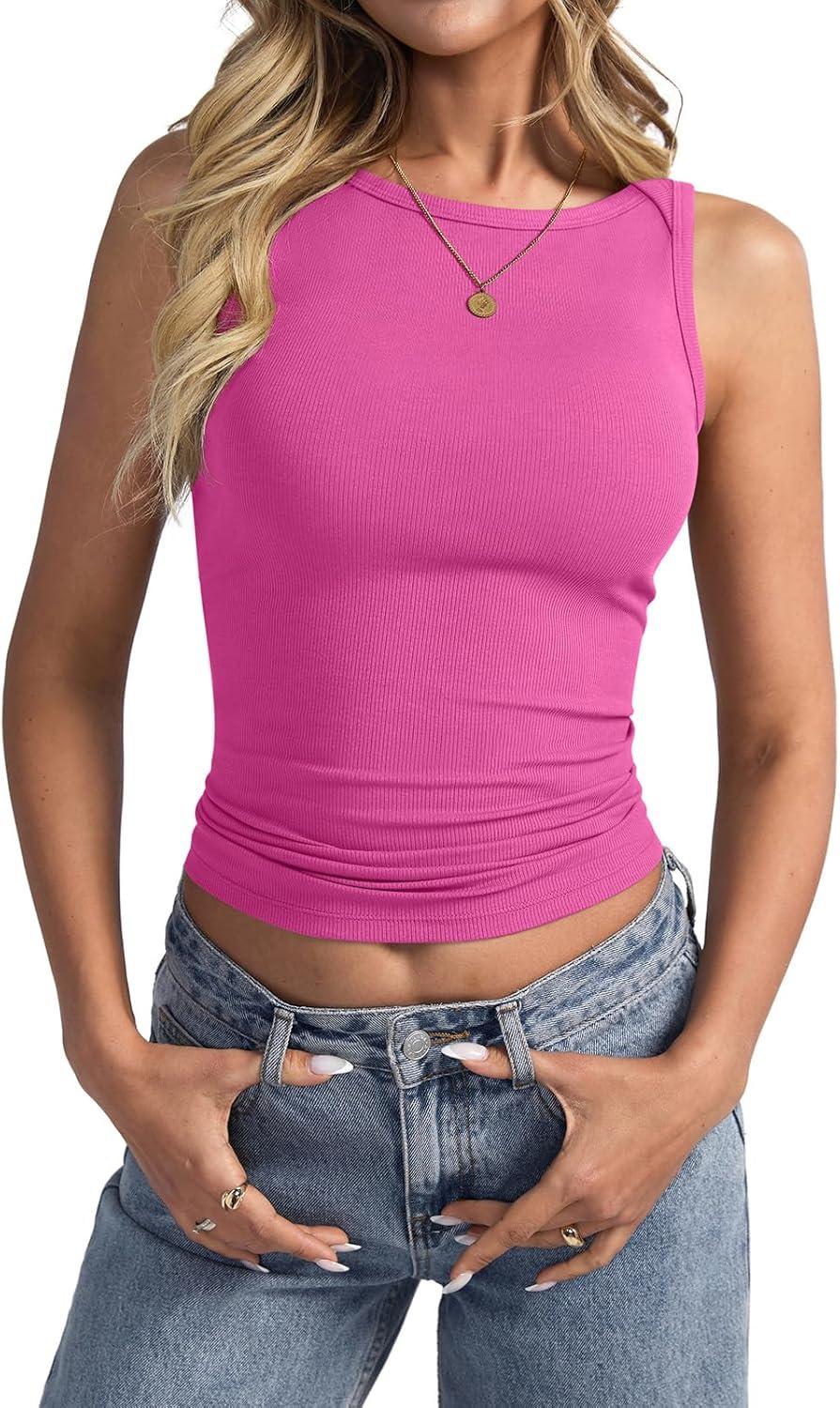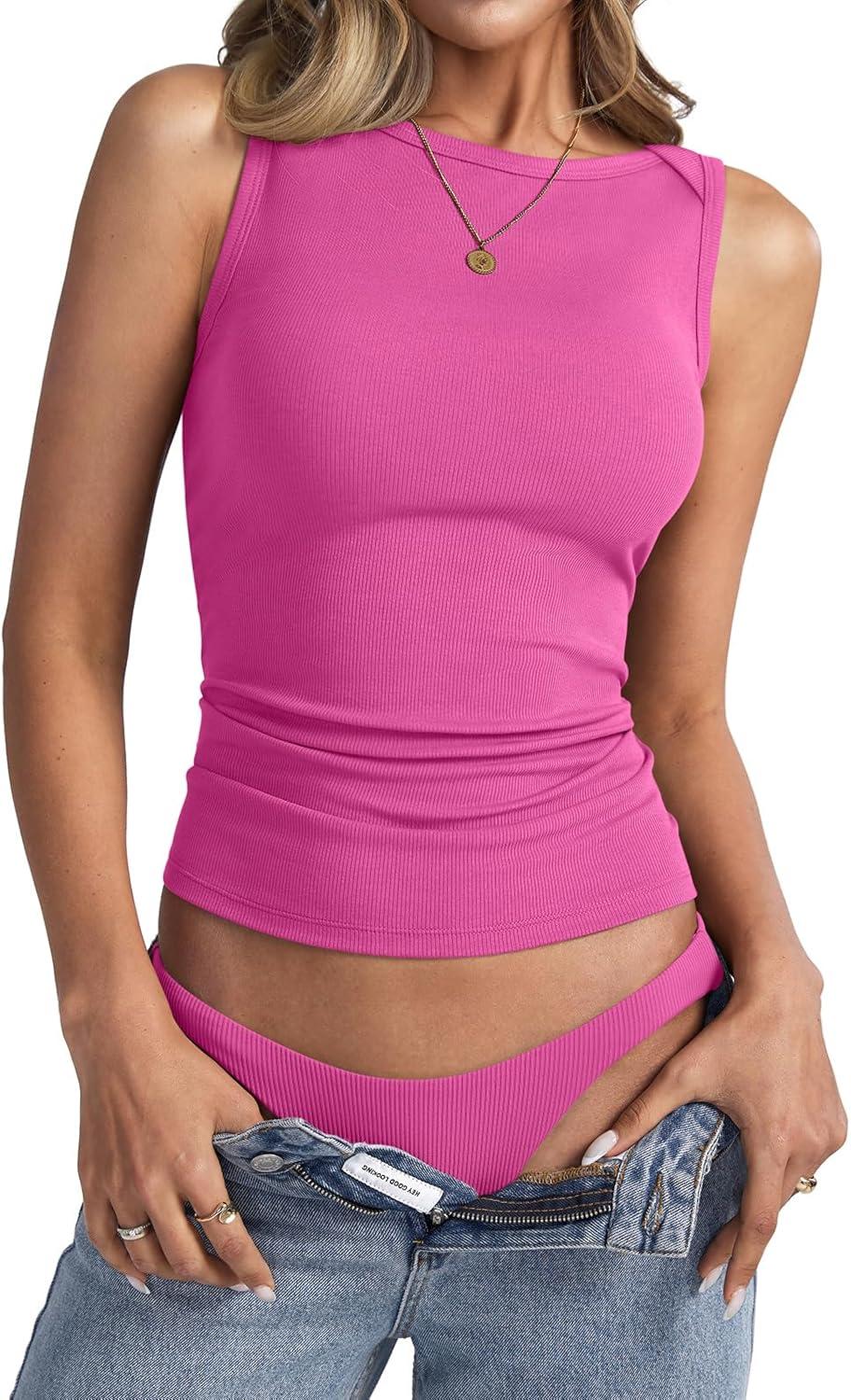 Womens Sleeveless Ribbed Tank Tops Boat Neck Slim Fit Shirts Summer Beach Vacation Clothes(Hot Pink)